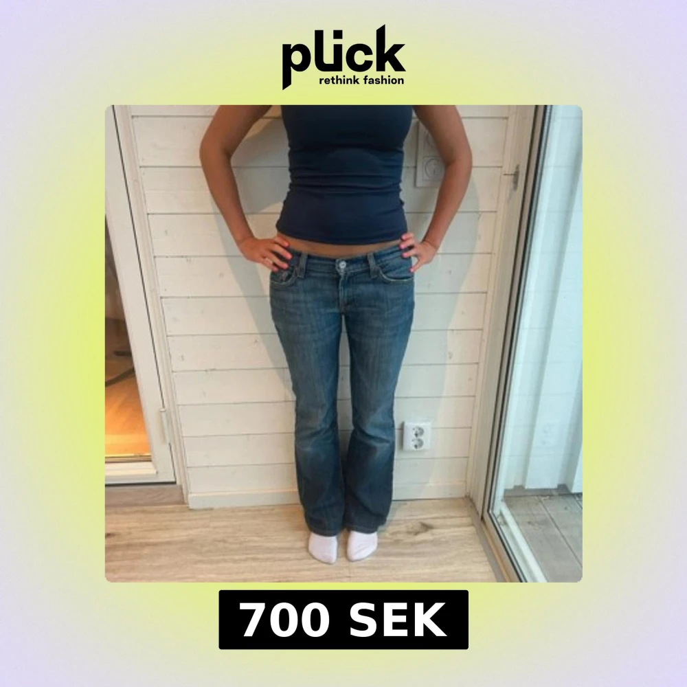 Supersnygga bootcut lågmidjade jeans i storlek W26. Passar storlek 34 och är bra i längd för mig som är 163 cm. Midjan är 37,5 cm rakt över och innerbenet är 76 cm.