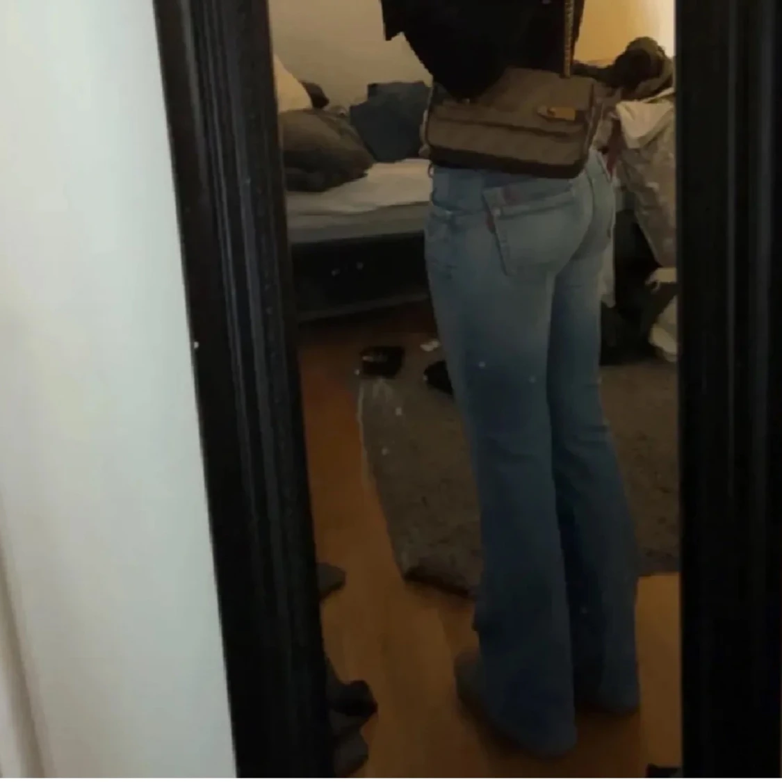Jättesöta ljusblåa lådmidjade flare jeans, köpta från plick men behöver sälja om då de är för stora, lånade bilder kontakta för egna bilder💓💓