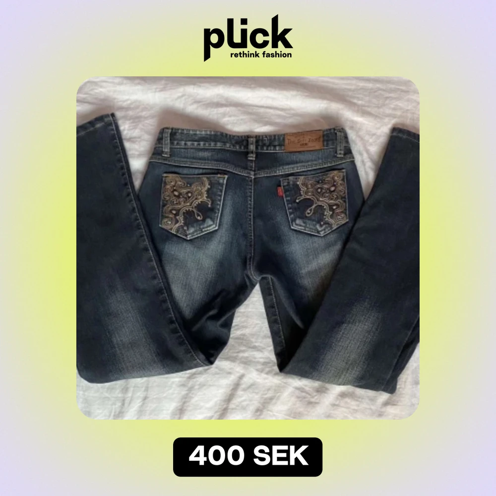 blågrå jeans m mönster på fram o bakfickor. köpta i sydkorea. stl står ej men typ 34/36/S. superskick! lite tjockare material på insidan. väldigt fint broderat mönster med små glitterstenar på! villig o diskutera pris! innerben 71cm o midjan 74cm💓