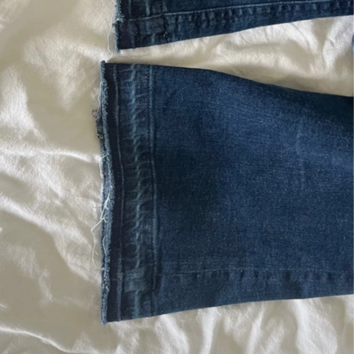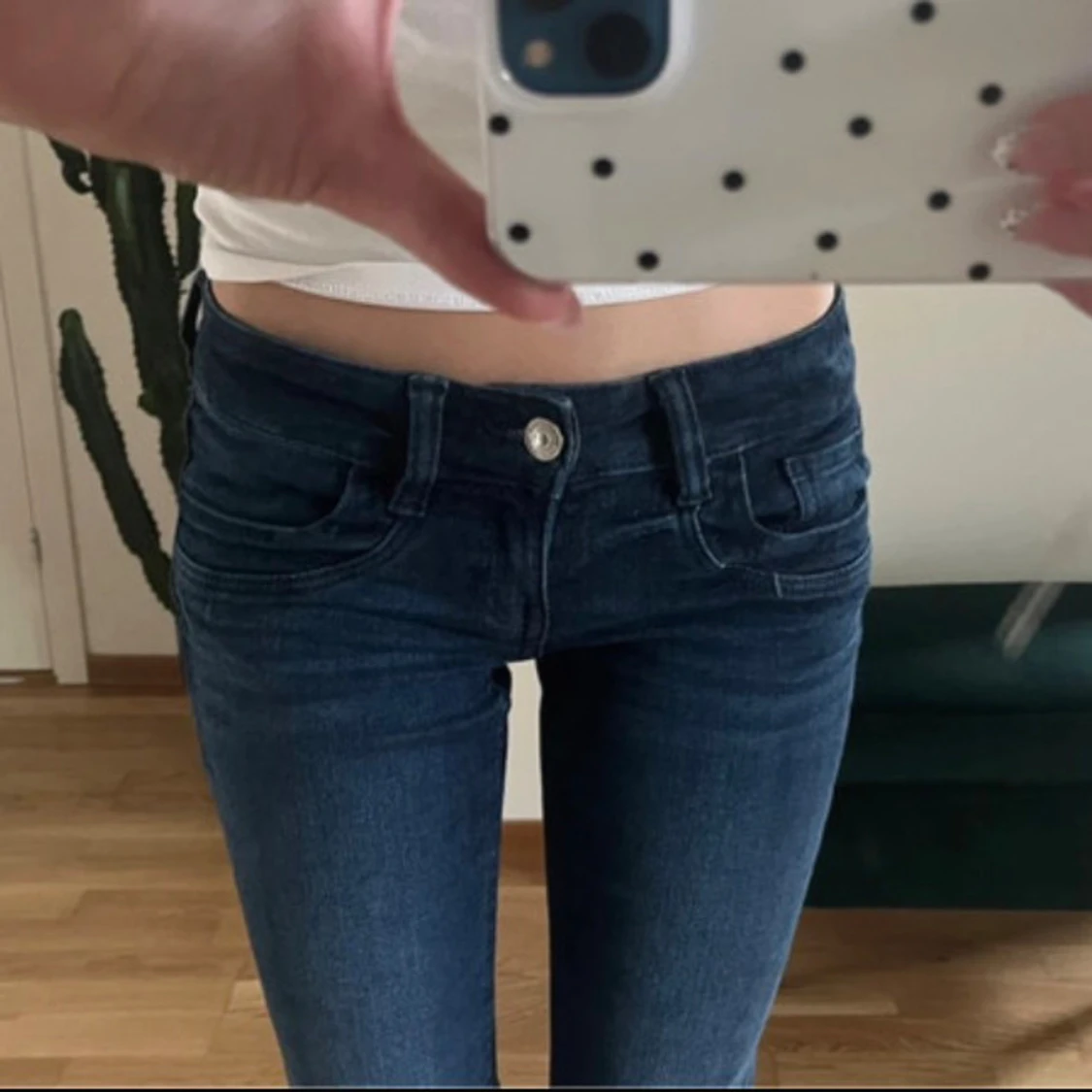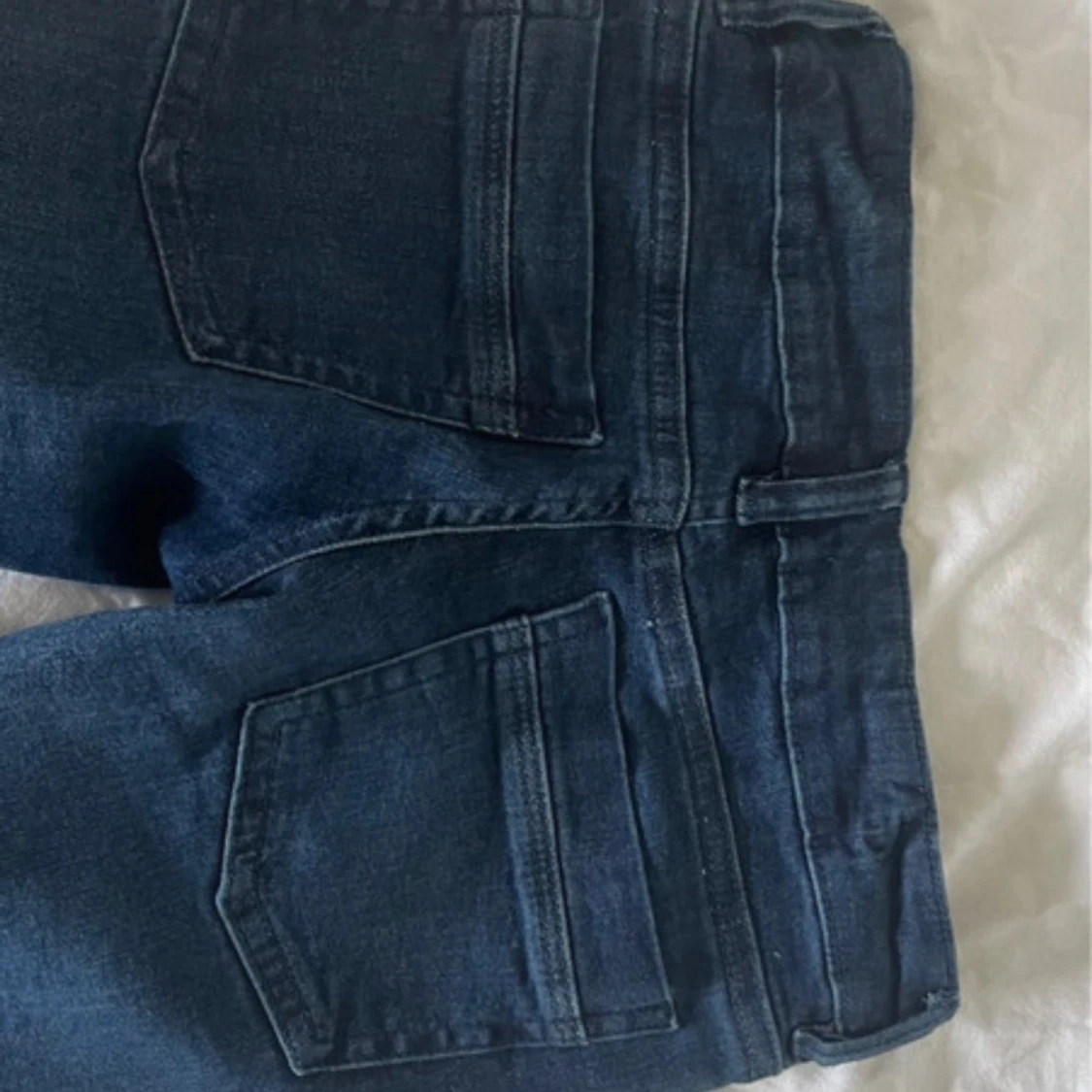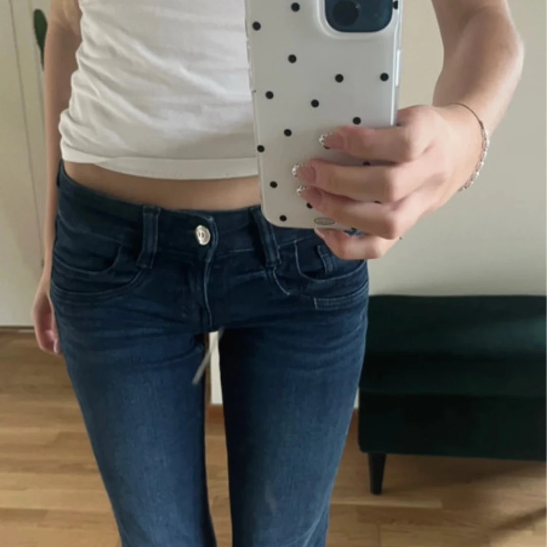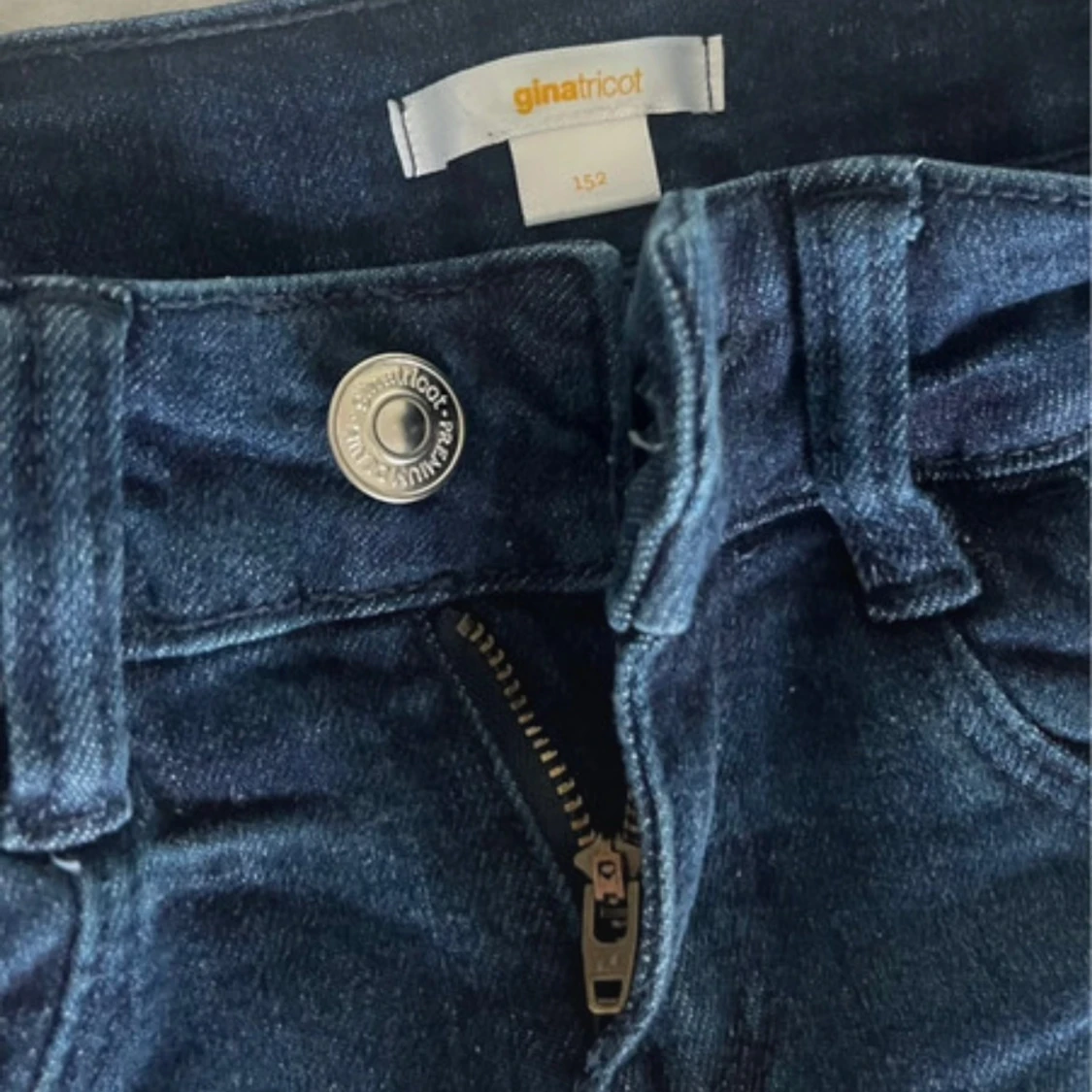 Snygga mörkblå jeans från Gina Tricot med låg midja och utsvängda ben. Storlek 152 men passar mig som har xs, nersprättade längst nere ❣️
