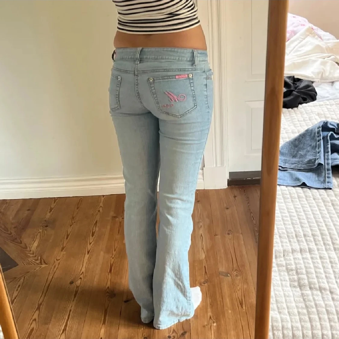 Säljer dessa super snygga ljusblå jeans ifrån mudd me rosa detaljer, säljer då de inte kommer till användning, midjemåttet är 37 cm tvärs över och innerbenslängden är 82 cm, bilderna är lånade, skriv vid frågor!!