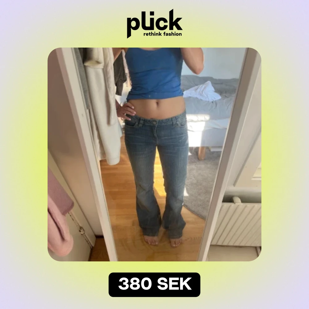 Lågmidjade i bootcut modell. Står inget märke eller storlek. Jag skulle säga att de är storlek s men fråga så kan jag skicka mer exakta mått!🩷