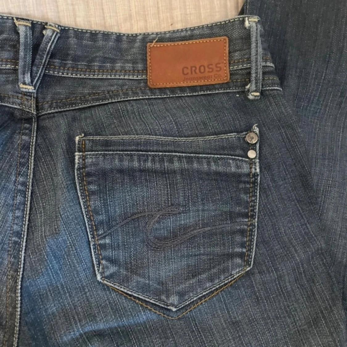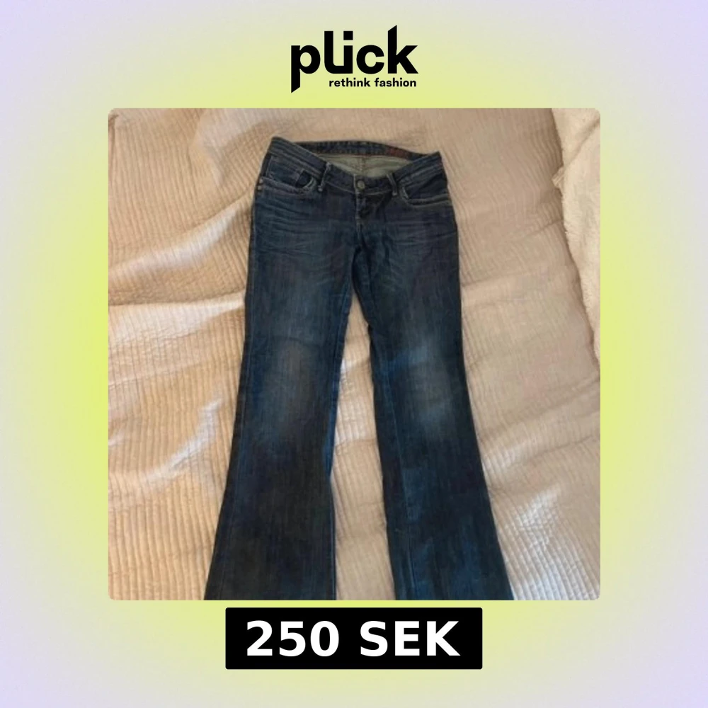 Inte min bild! Snygga vintage jeans!💕 Midjemått( rätt över): 36cm Inerbenslängd: 73cm Lårmått ( rätt över): 23cm Modellen på bilden är 170cm (som ni ser är dem lite korta)