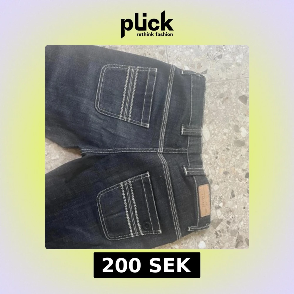 Snygga mörkblå jeans från Lacoste med vita sömmar. Midjemått: 37cm rakt över, Innerbenslängd: 79cm, Grenmått: 20cm🫶