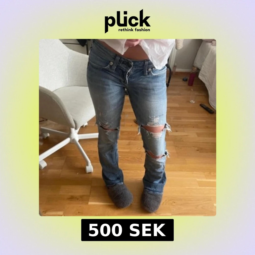 Snygga lågmidjade bootcut jeans med hål. Köpta på vinted men var tyvärr lite stora. Midjemått: 36 innerben: 78