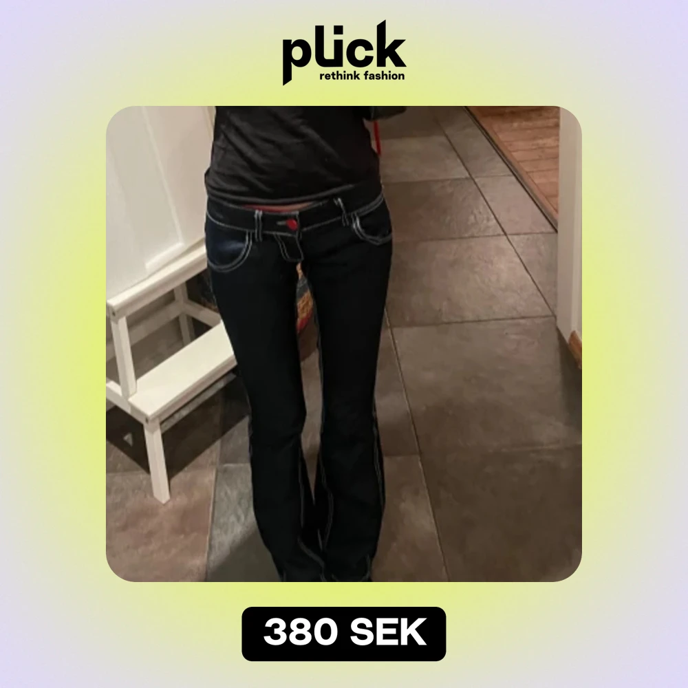 Lågmidjade bootcut jeans, rätt stretchiga material, midja 36 tvärs över (de är väldigt lågmidjade) innerbennslängden ca 85cm💕 de har röda detaljer och vit stitching