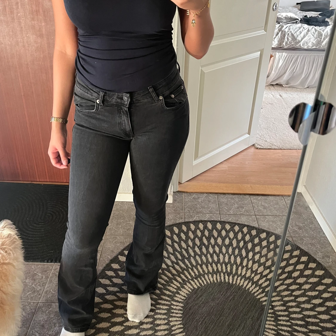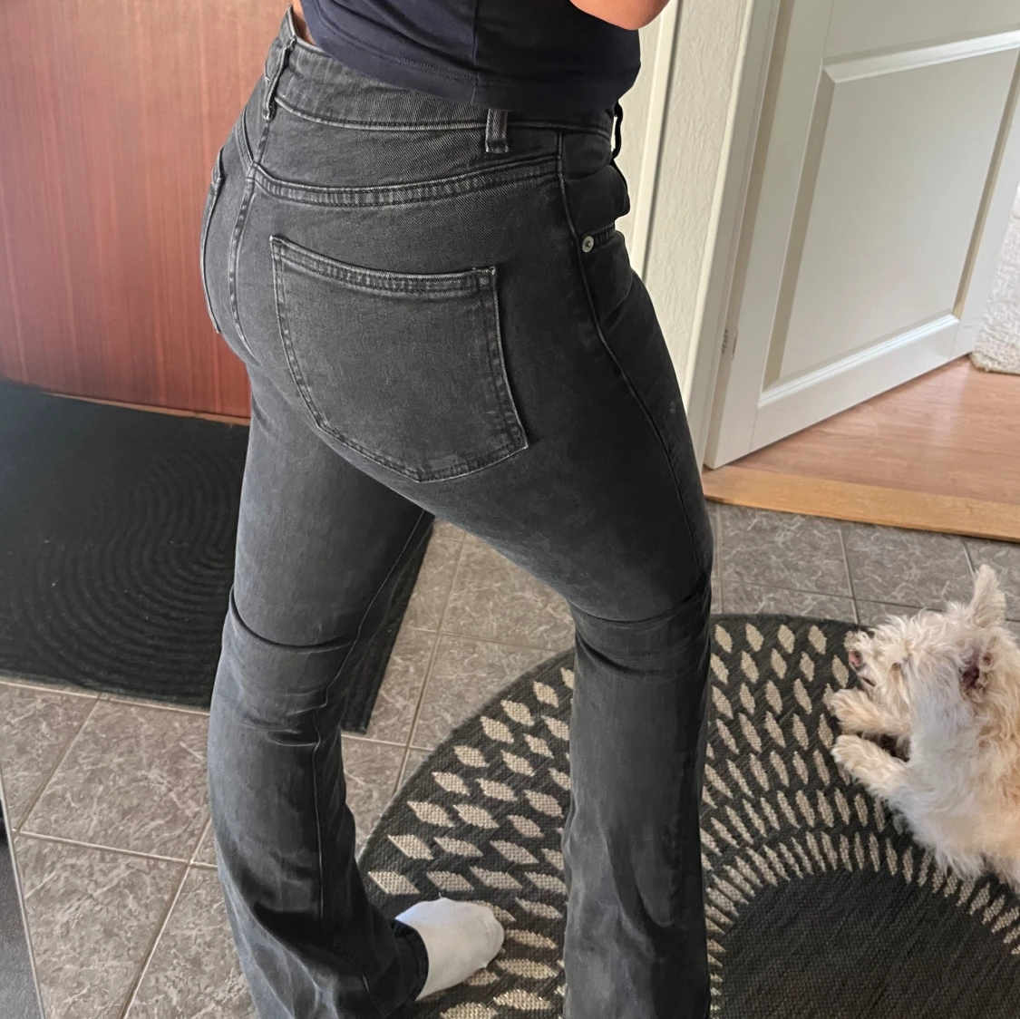 Säljer dessa lågmidjade svarta/grå jeansen för de är för små! De är bra längd på mig som är 168 och lagom i midjan!