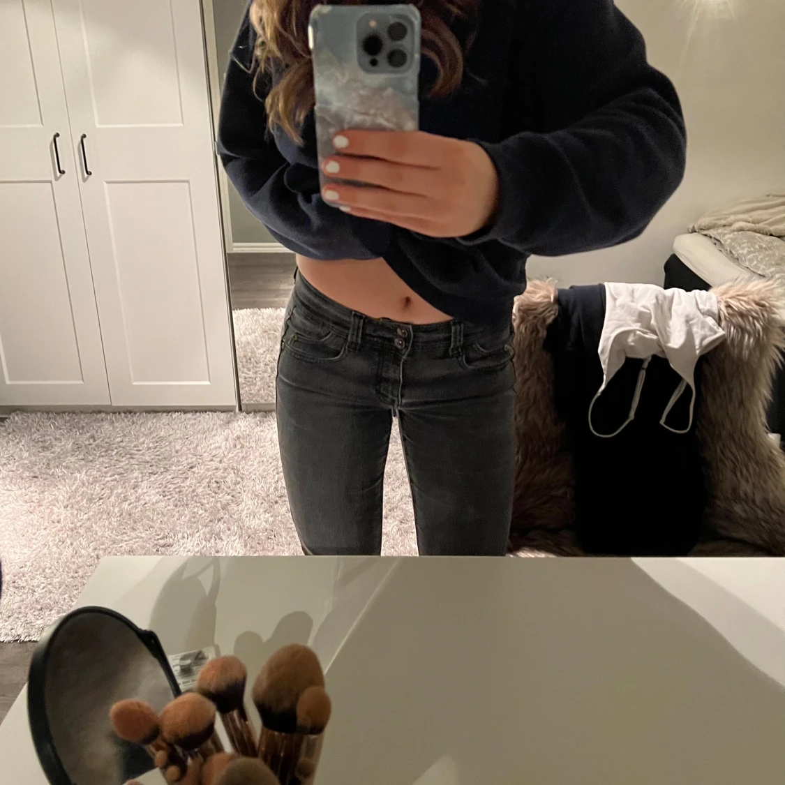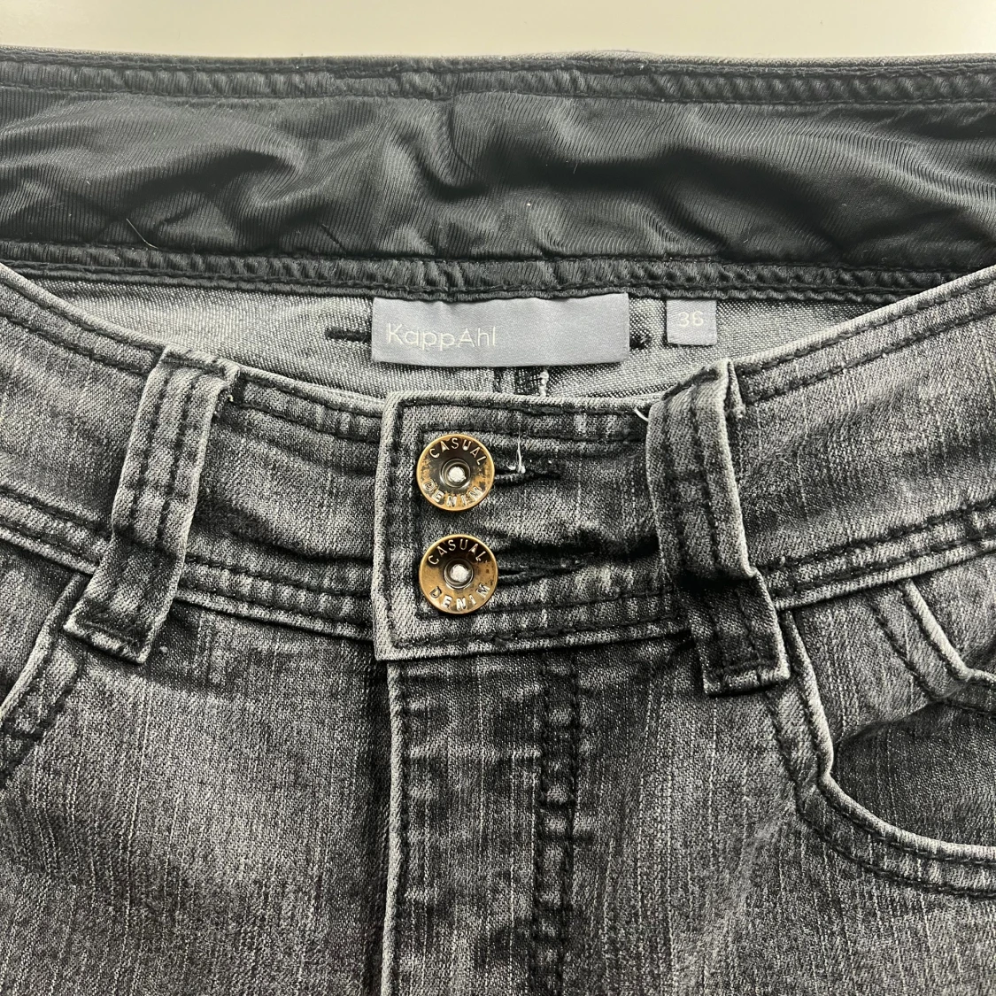 Lågmidjade svarta/mörkgråjeans från Kappahl. Lite slitna i innelåren annars i perfekt skick. Kom privat vid frågar om mått. Pris kan diskuteras.