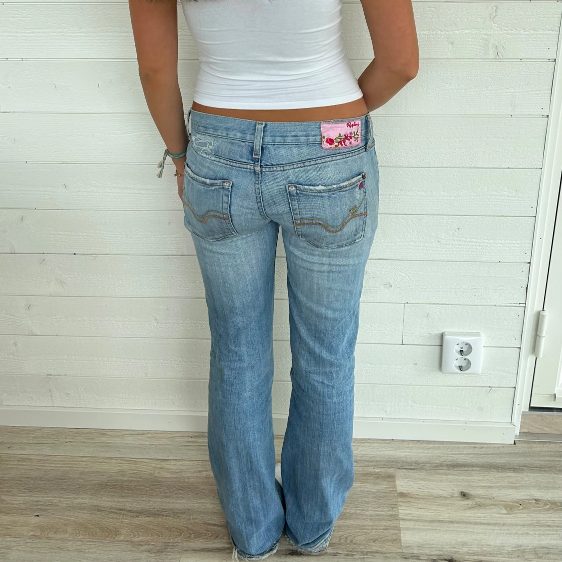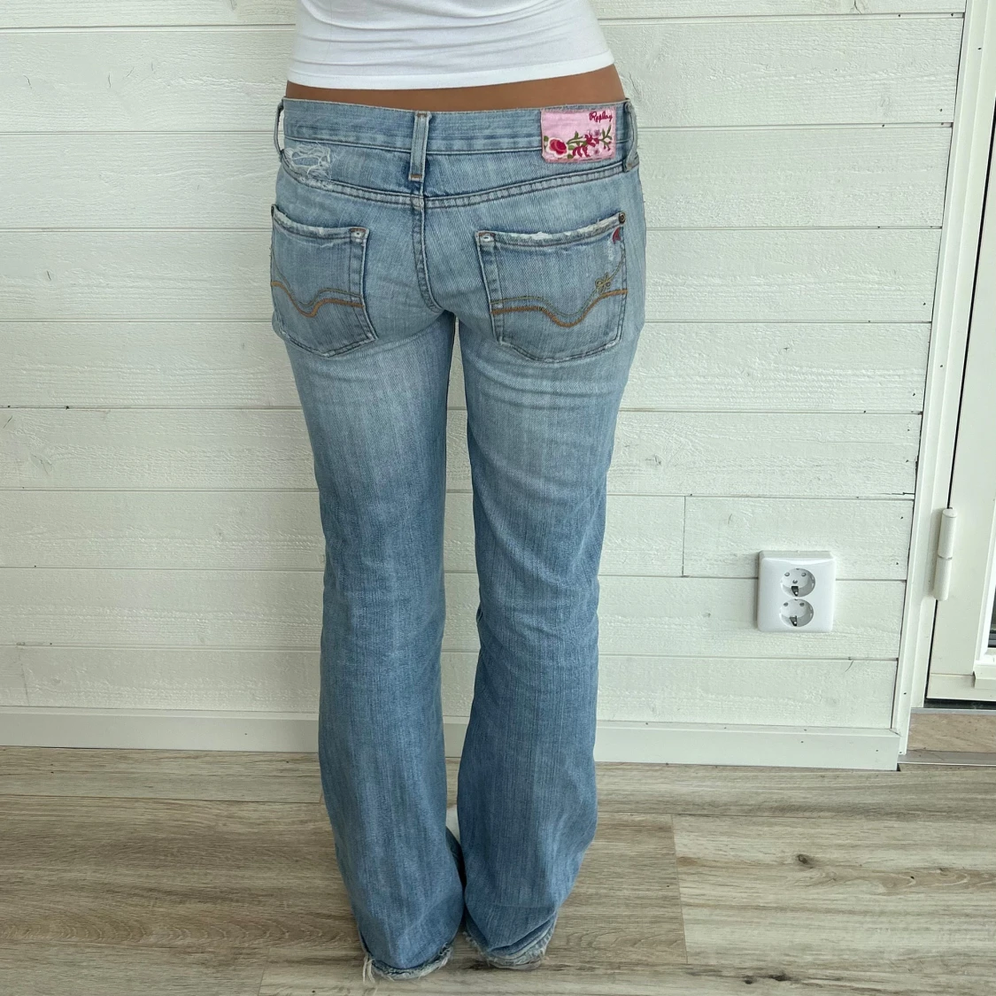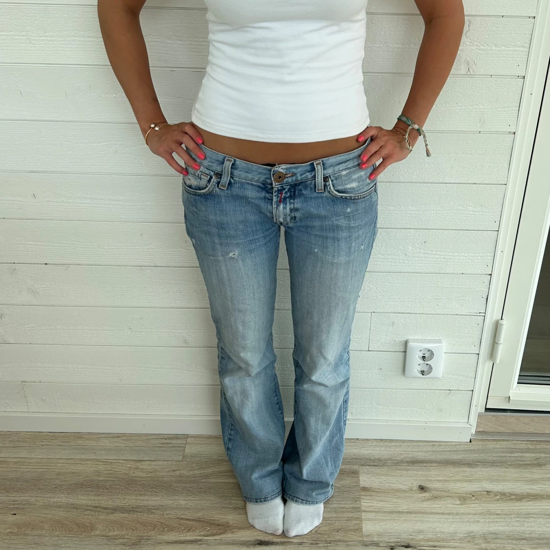 Ljusblå lågmidjade replay jeans i storlek XS. De är lagade på två ställen, skriv för bilder