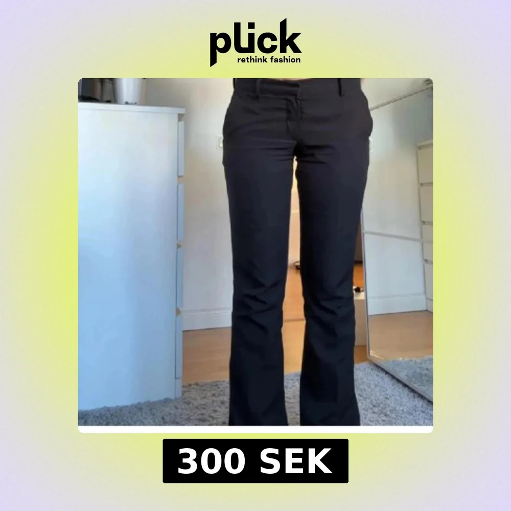 Snygga svarta kostymbyxor med hög midja och bootcut-stil. Byxorna Àr i bra skick. Perfekta för en stilren look. Byxorna Àr lÄgmidjade med knappar och dragkedja framtill. ( lÄnad bild )