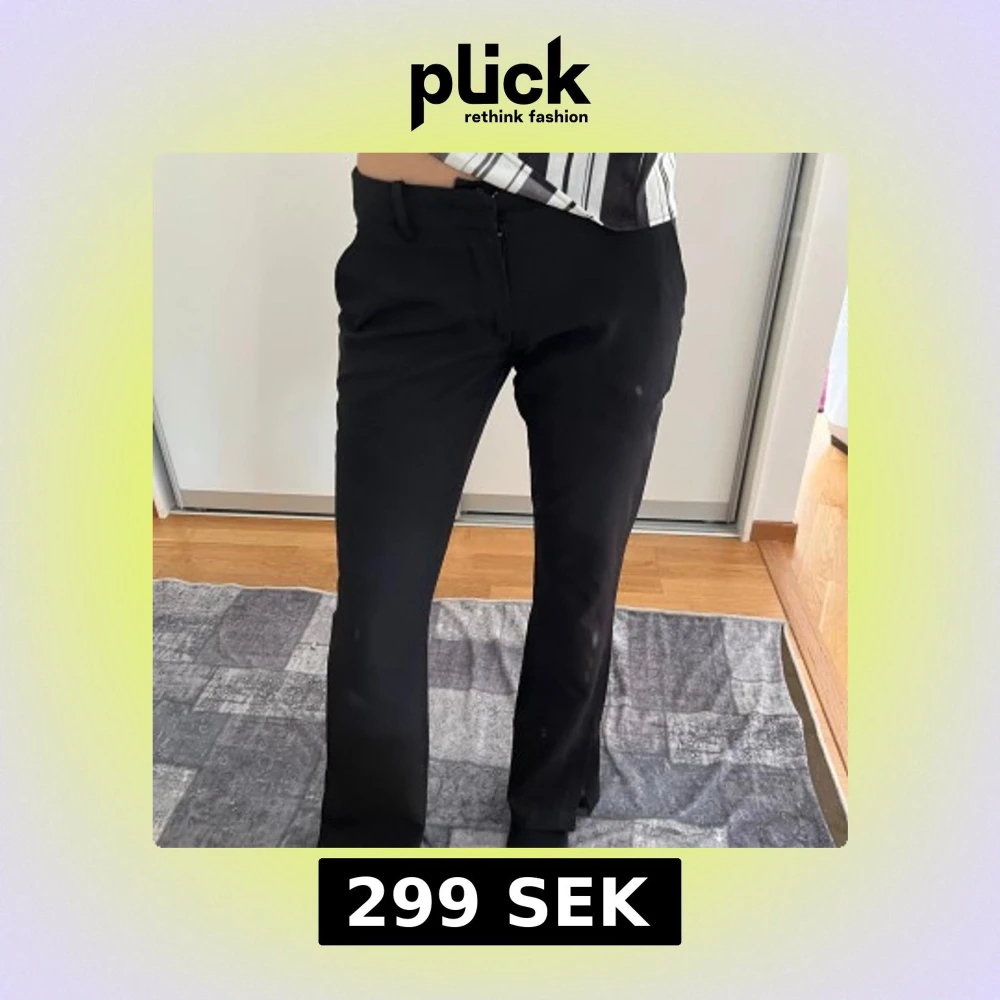 Snygga svarta kostymbyxor med bootcut. Det är de originella BikBok Vera kostymbyxorna som de har ändat designen på. Så synd att de inte passar mig längre, då BikBok inte tillverkar denna design längre. De Vera byxorna som produceras nu har annorlunda tyg nu som nopprar lätt, utan slits och dålig passform. Dessa hade jag nästan velat behålla själv, men det är ingen idé då de inte passar mig längre.