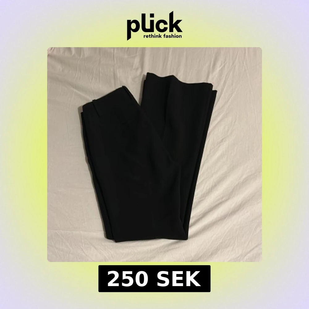 Snygga svarta kostymbyxor från Mango med låg midja och bootcut-stil. Perfekta för en stilren look. Byxorna har en klassisk design med hällor för bälte och diskreta fickor.