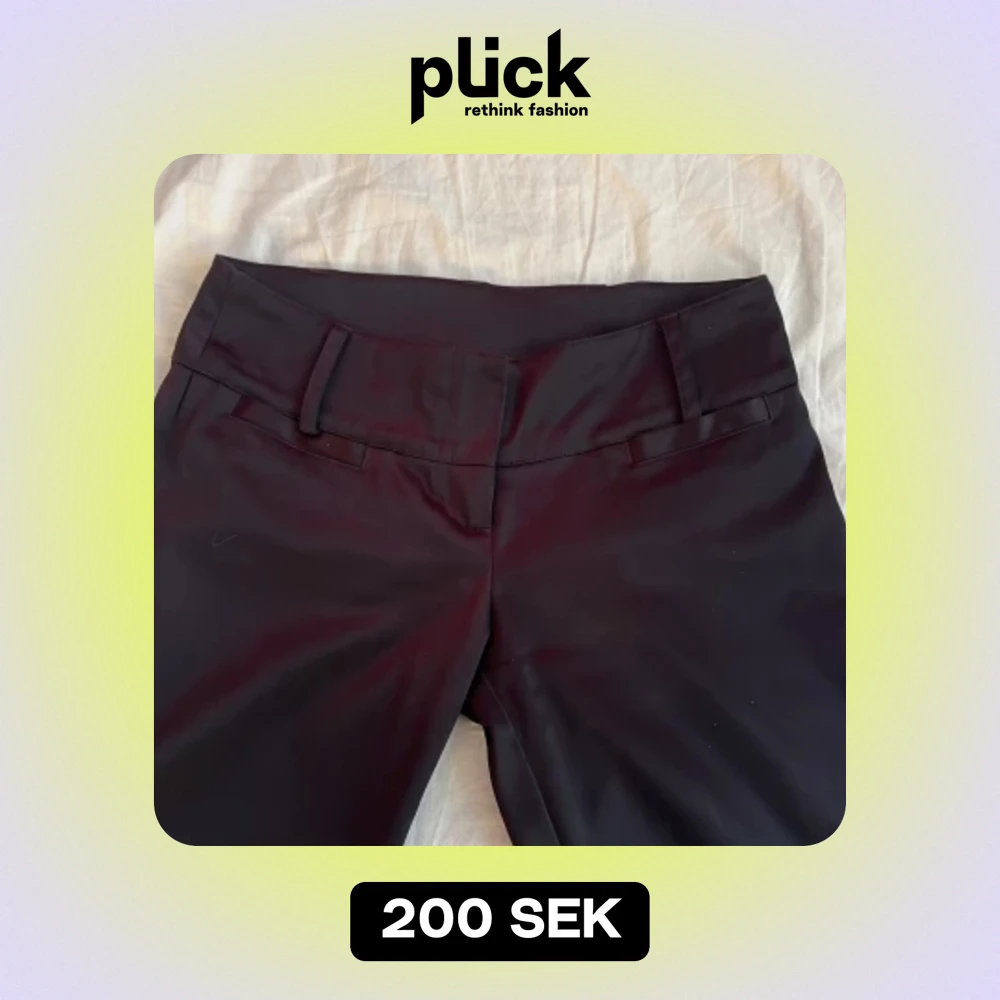 Lågmidjade kostymbyxor utsvängda vid benen i ett glansigt material.