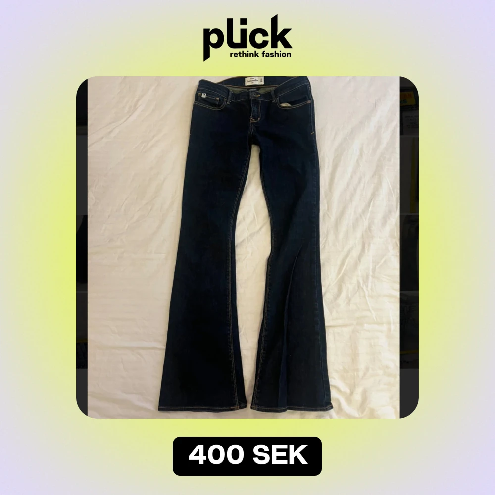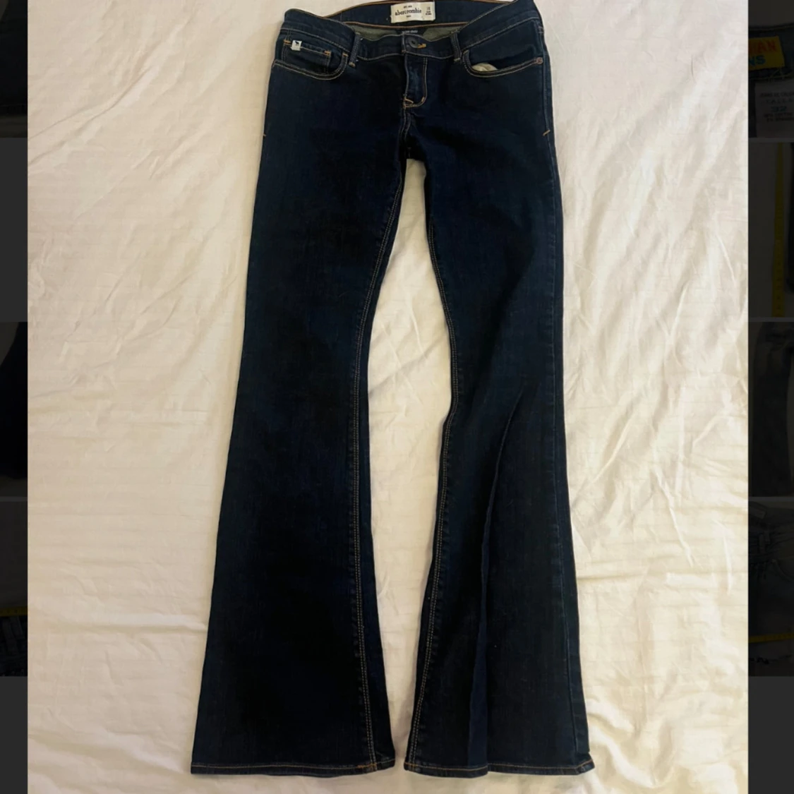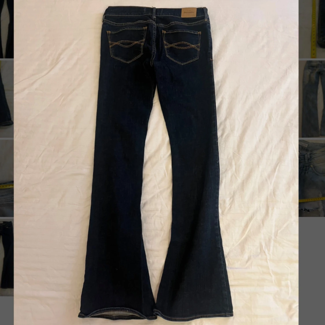 Såå fina mörkblå Lågmidjade utsvängda jeans från abercrombie i nytt skick! Midjemått, innerbensmått och ytterbensmått finns bland bilderna. Grenmått: 19cm ❣️
