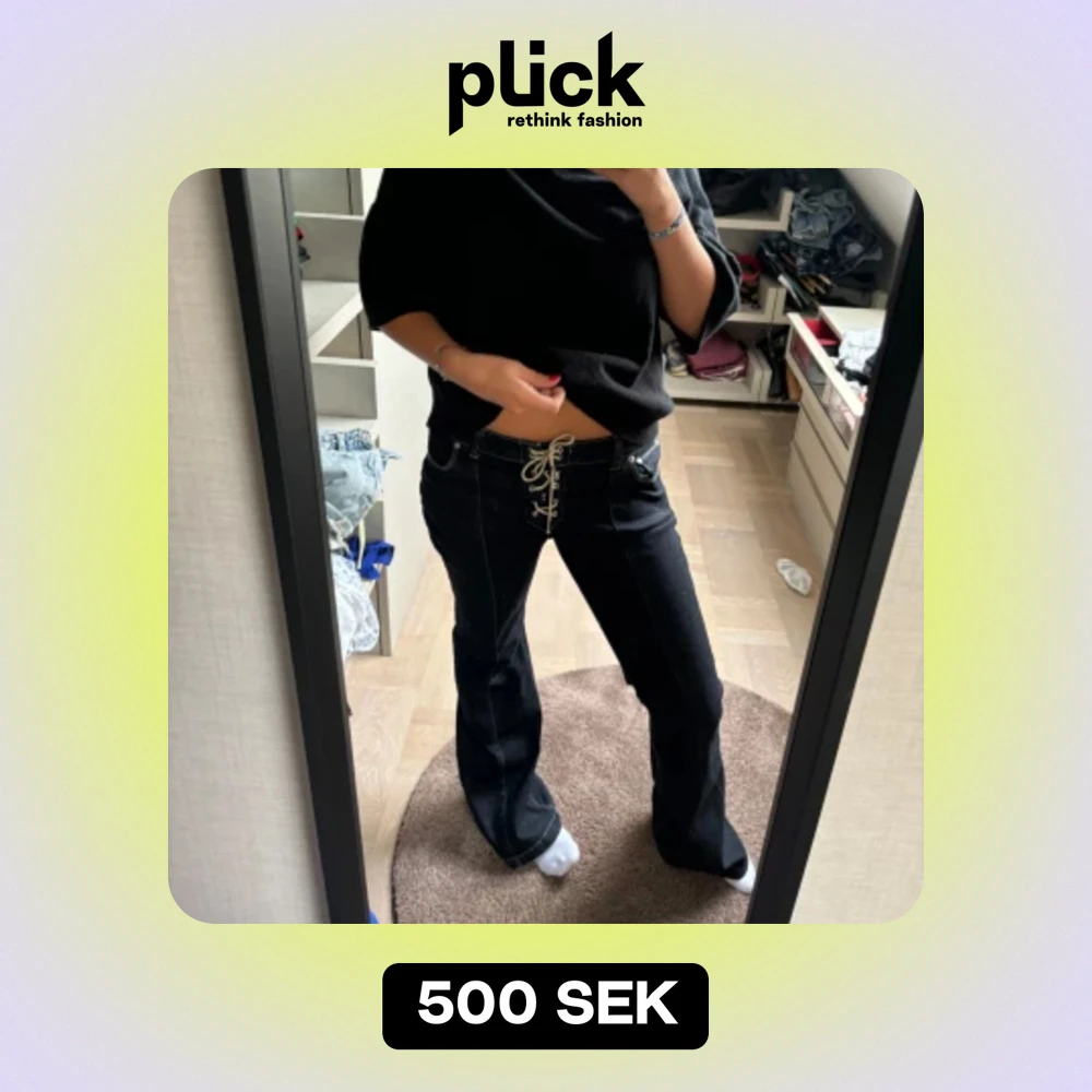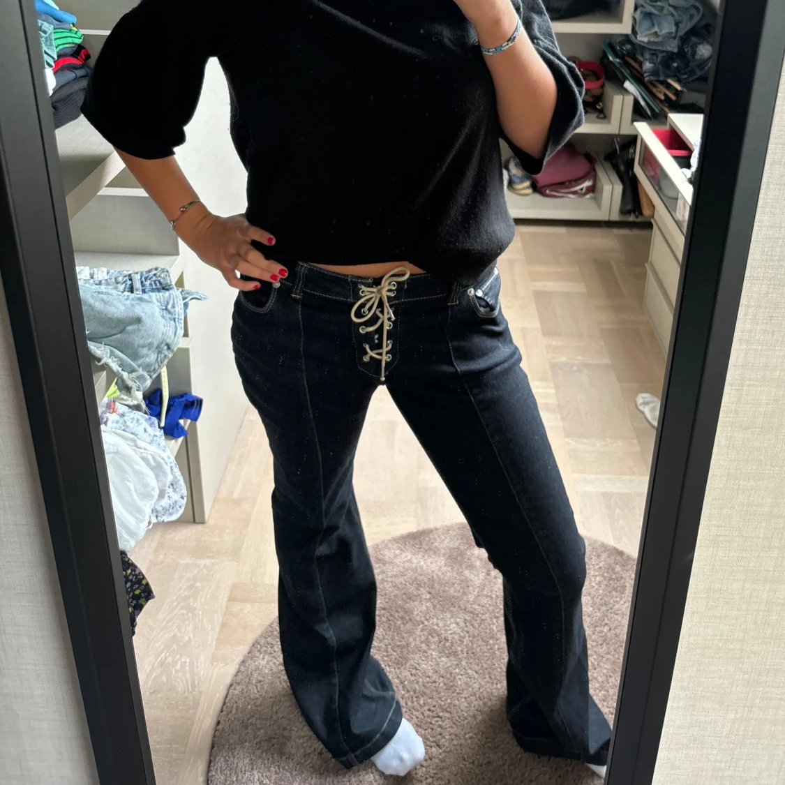 Finns ej att köpa längre! Sjukt snygga lågmidjade bootcut jeans med unik knytning som man kan göra lite vad man vill med. De är justerbara i storlek då man kan knyta själv.