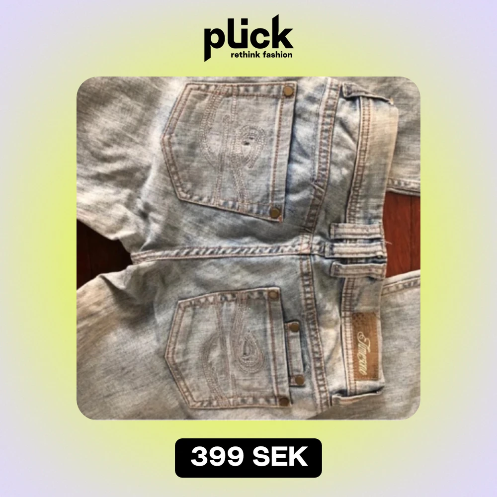 (Strl 26/32) Så snygga vintage jeans! Säljer då de inte riktigt passar mig, köpta av en annan tjej på plick, hennes bild på första🥰 Pyttelite slitningar som jag kan skicka bild på Innerbenslängd:80cm Ytterbenslängd:100cm Midjemått rakt över:35-36cm
