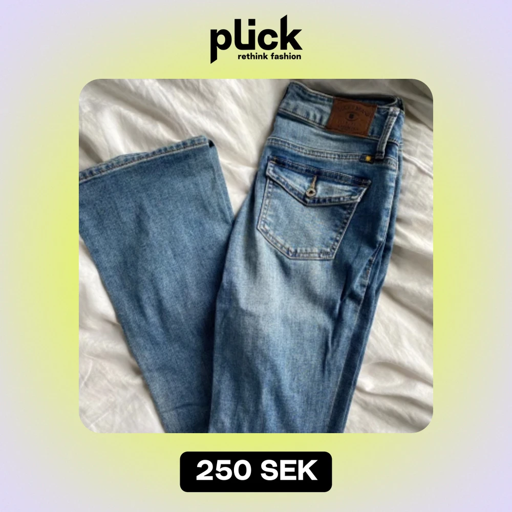 Toppen skick! Jag kan tyvärr inte visa hur dom sitter på då dom är försmå. Men dom är lågmidjade och utsvängda. 💕 Midjemått: 75cm Innerbenslängd: 82cm