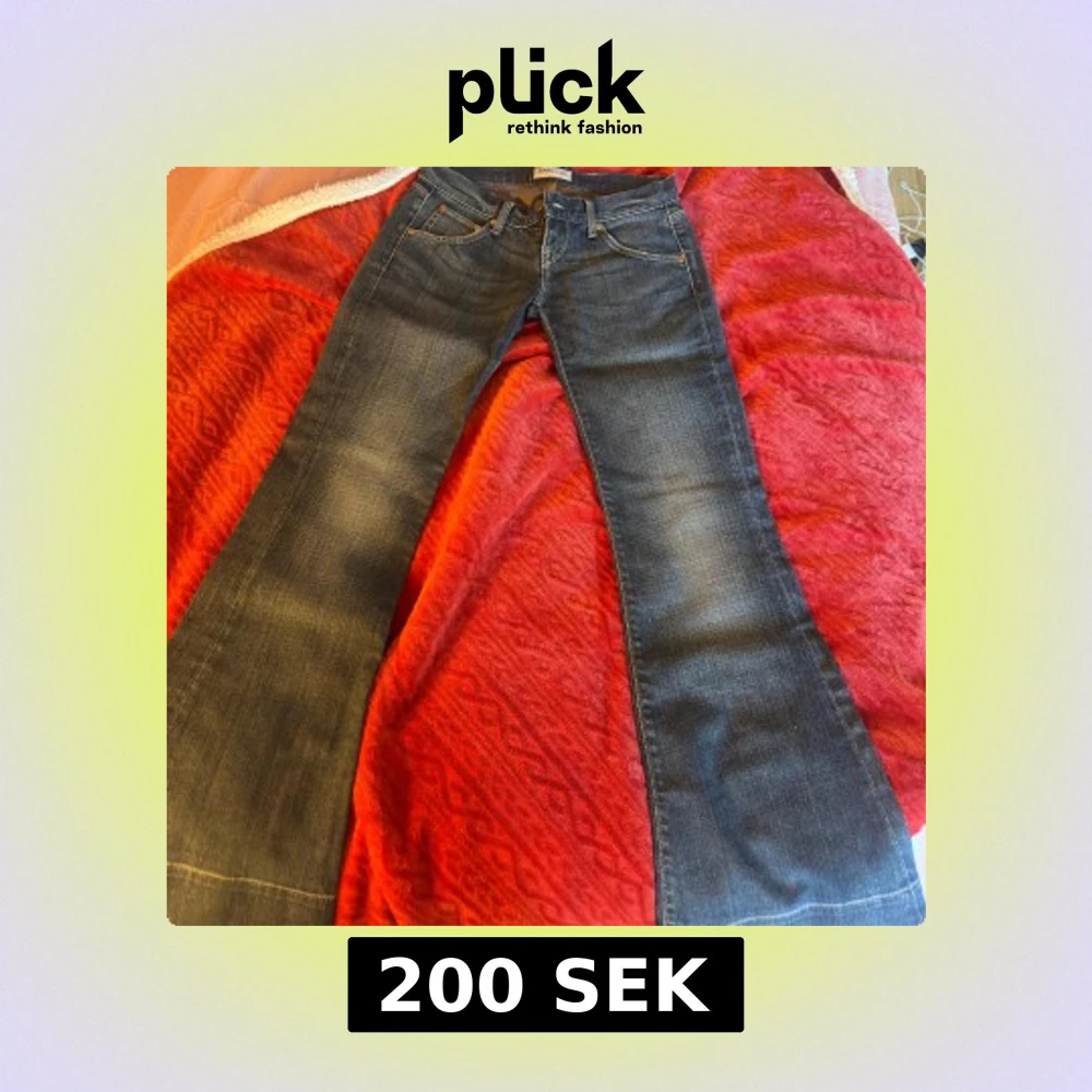 Jättesnygga lee jeans som jag tyvärr måste sälja då dem är för små för mig. Lågmidjade och är blå/svarta i färgen. Utsvängda och är storlek W26 L33. Mått 38cm i midjan och innerbenslängden är 80cm. Har en trasig gylf, men det syns inte när man har på dem då den är ca 2cm. Även en upprivning vid bältes hålen men inget som syns.
