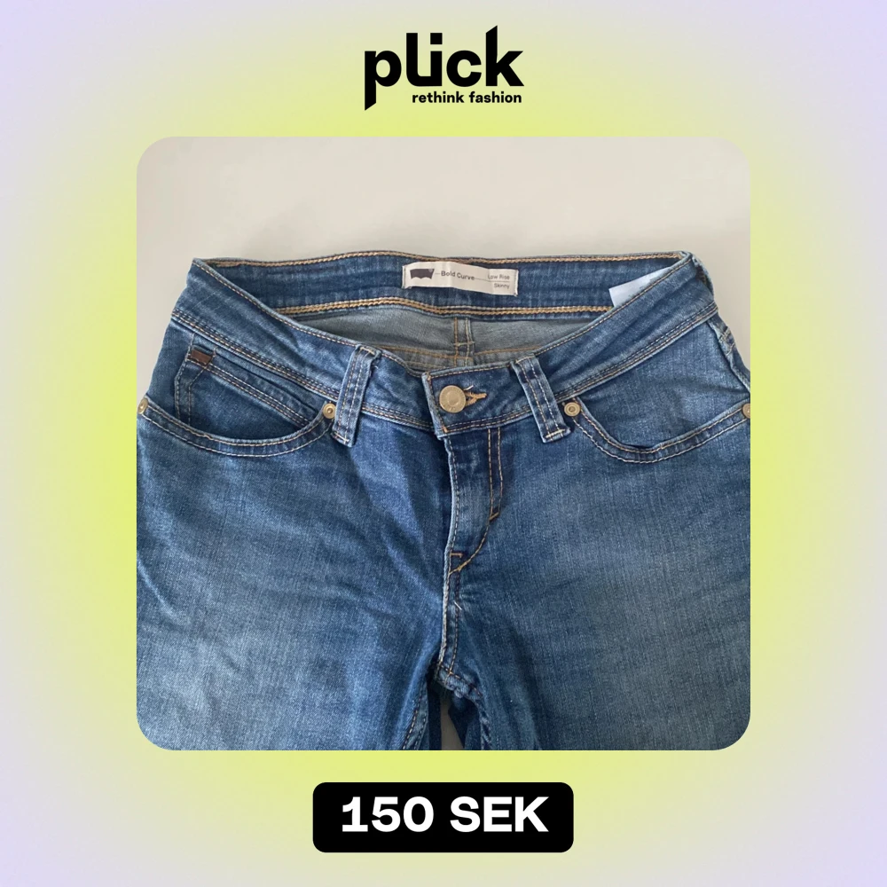 Säljer ett par snygga blå jeans från Levi's i modellen Bold Curve. De är lågmidjade och har en skinny passform. Perfekta för en casual look med slitna detaljer vid fållen. Passar både till vardags och fest!