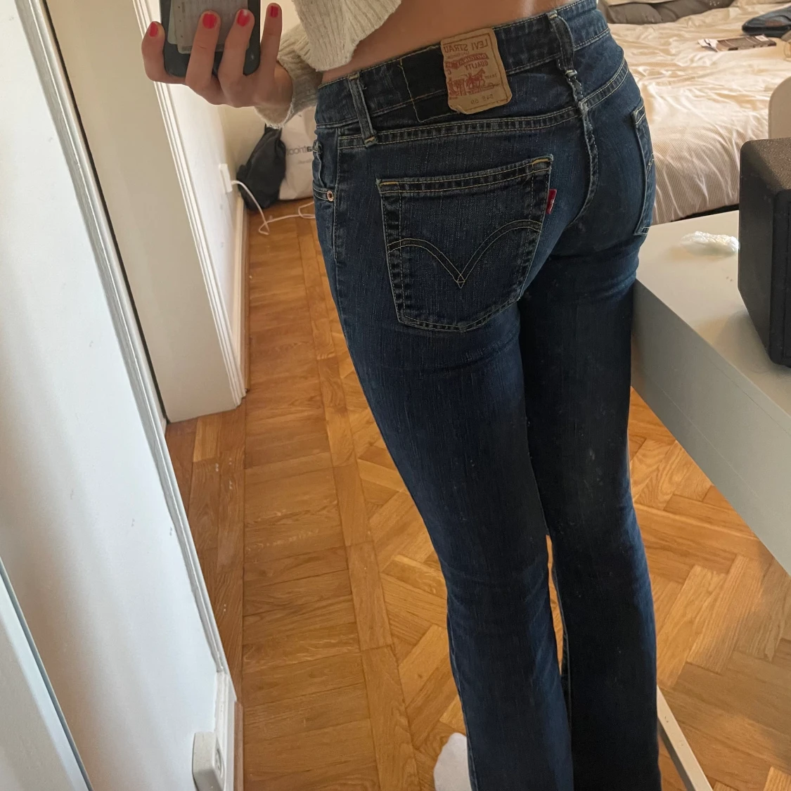 fint skick❤️ lågmidjade bootcut levis jeans 💕 de är uppsprättade längst ner för att bli lite längre💕midjemått 72cm innerbenslängd 82cm