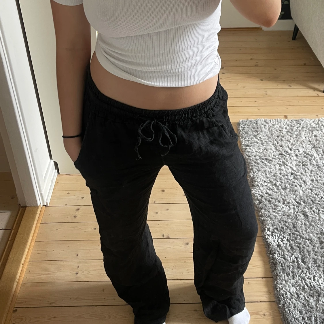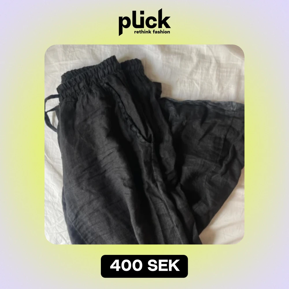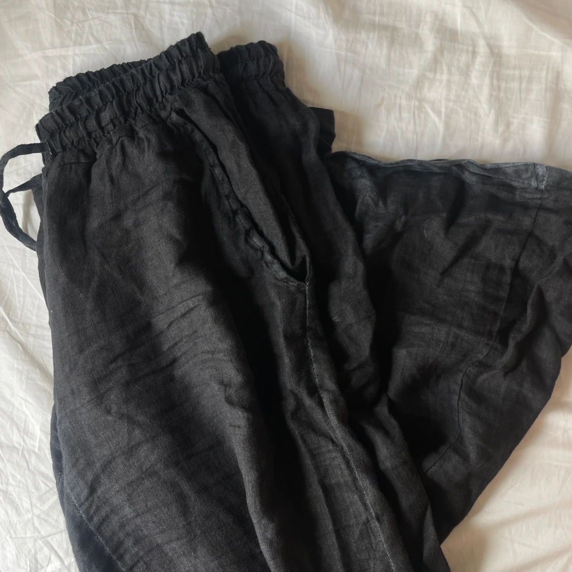 Såå fina linnebyxor från förra sommaren! Långa, släpar under hälen på mig som är 165 (lite slitage på hälen, se bild) men går säkert att sy upp om man vill det🙌 Köpta från Chelsea i Göteborg, 100% linne!