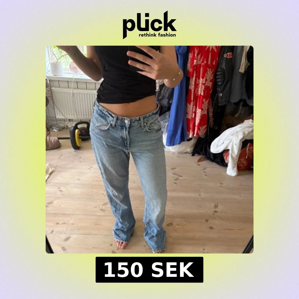 Säljer ett par klassiska jeans i ljusblå tvätt med låg midja och rak passform. Jeansen har fem fickor, knappgylf och slitna detaljer vid bensluten för en cool vintagekänsla. Perfekta för dig som gillar avslappnad och tidlös stil.