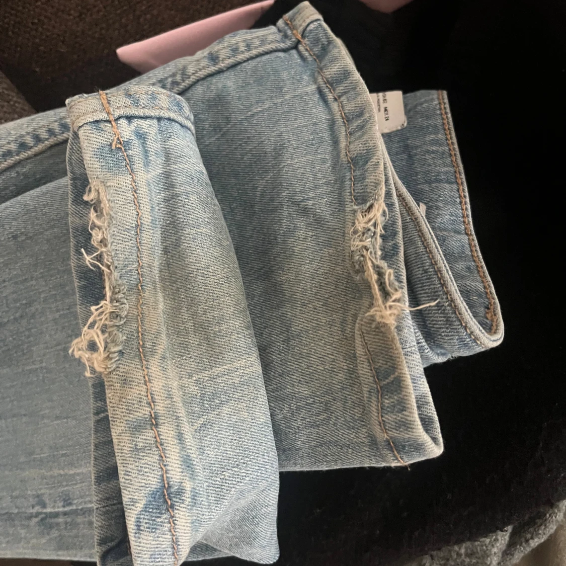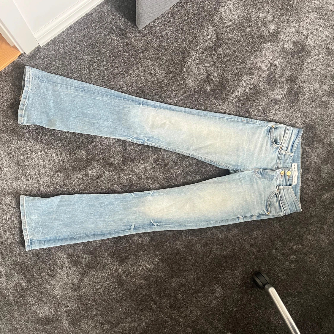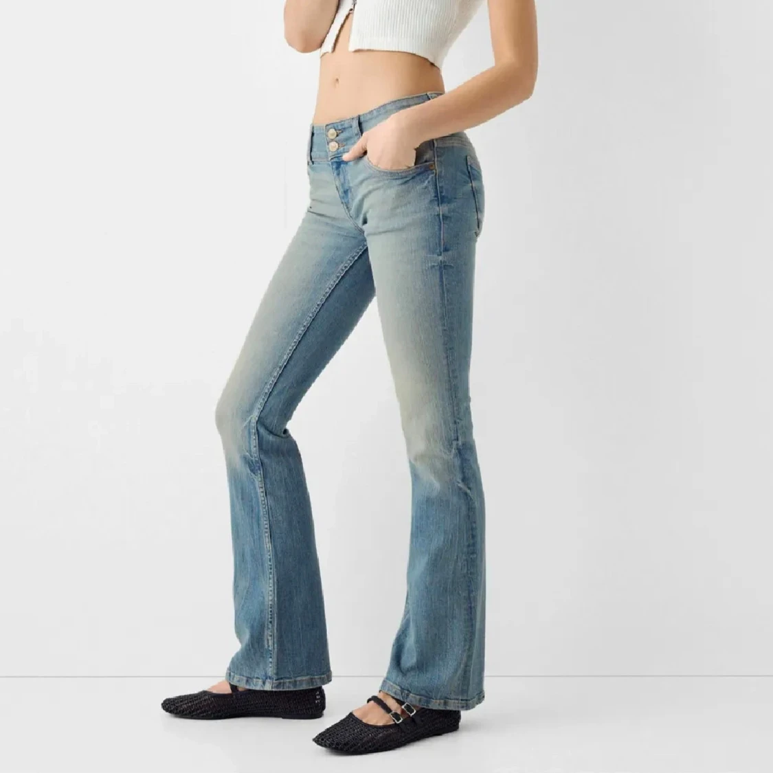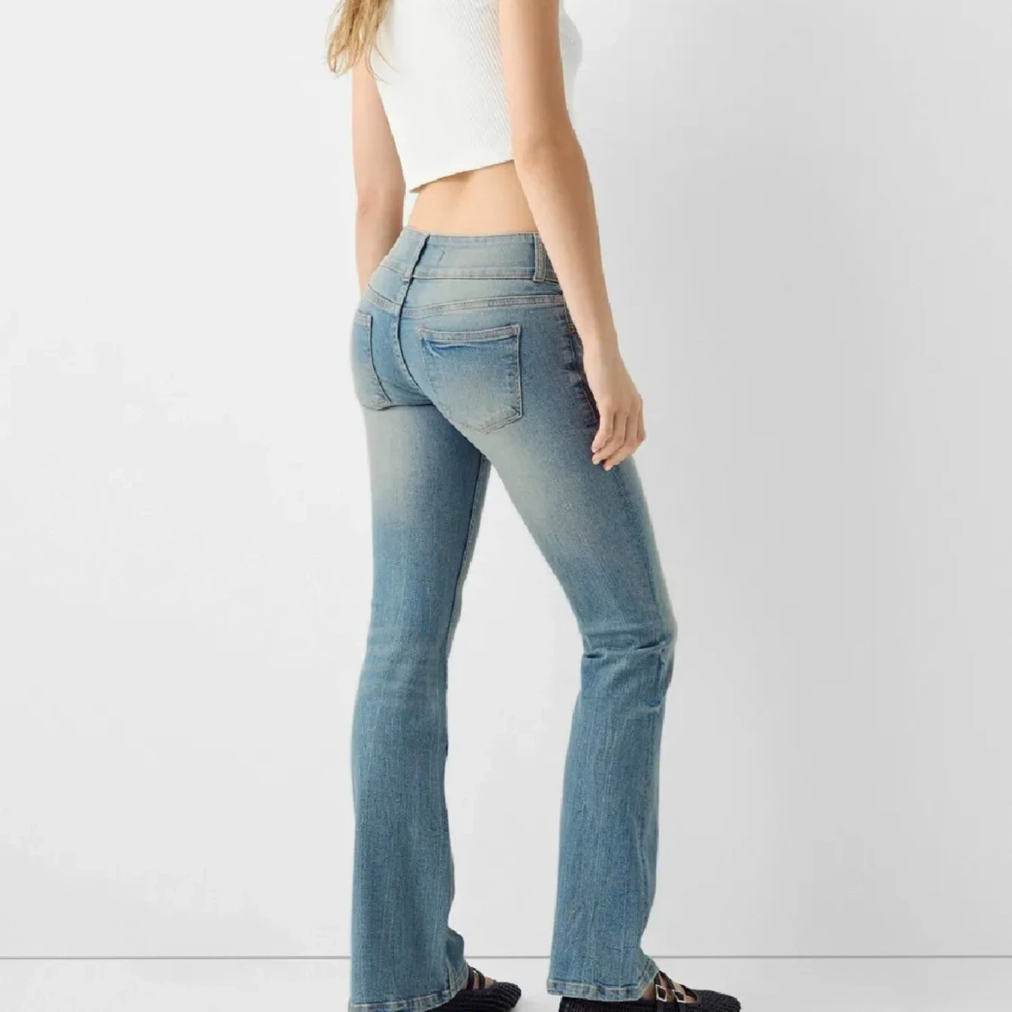 Säljer ett par snygga ljusblå jeans från Bershka med bootcut passform och låg midja. Jeansen har två knappar vid midjan. De är i storlek 34 alltså XS. Jag köpte de från en annan person på appen men har själv aldrig använt de💕💕
