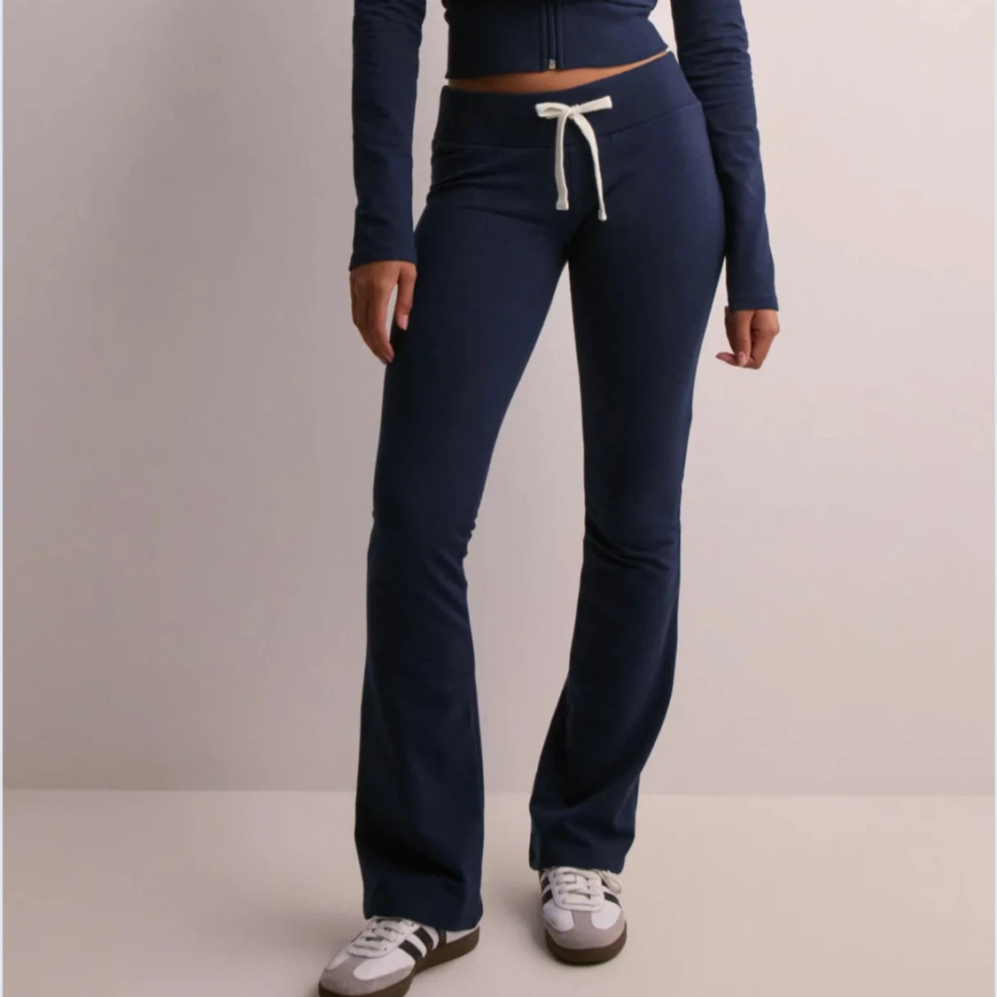 Helt slutsålda !!!! Populära byxorna i mörkblåa färgen -modell med lätt utsvängda ben och sitter tajt upptill. Tillverkade i mjukt bomullsmaterial som är skönt mot huden. Perfekta för en chill och avslappnad look. Liknar russe merch byxorna jätte mycket