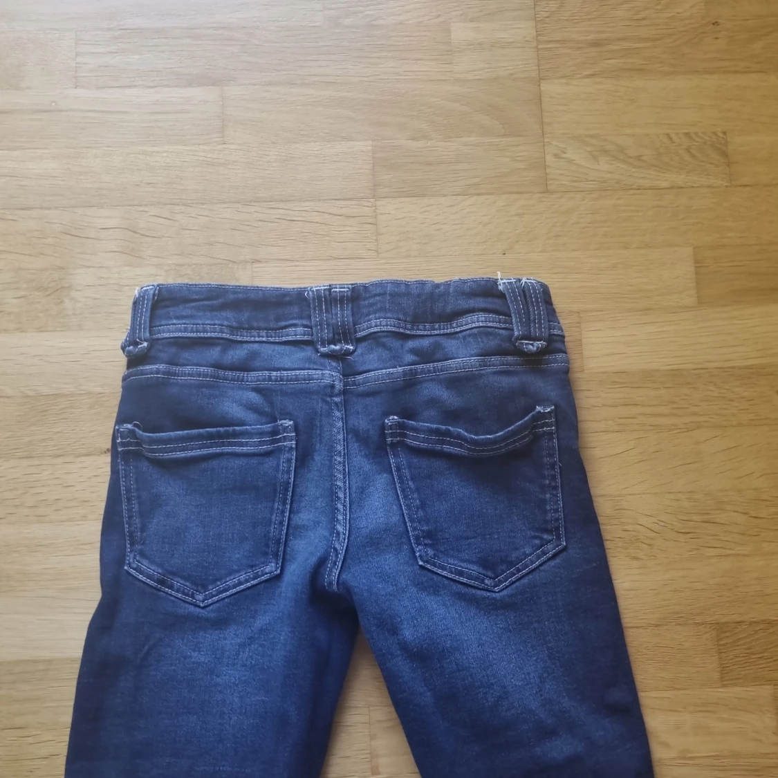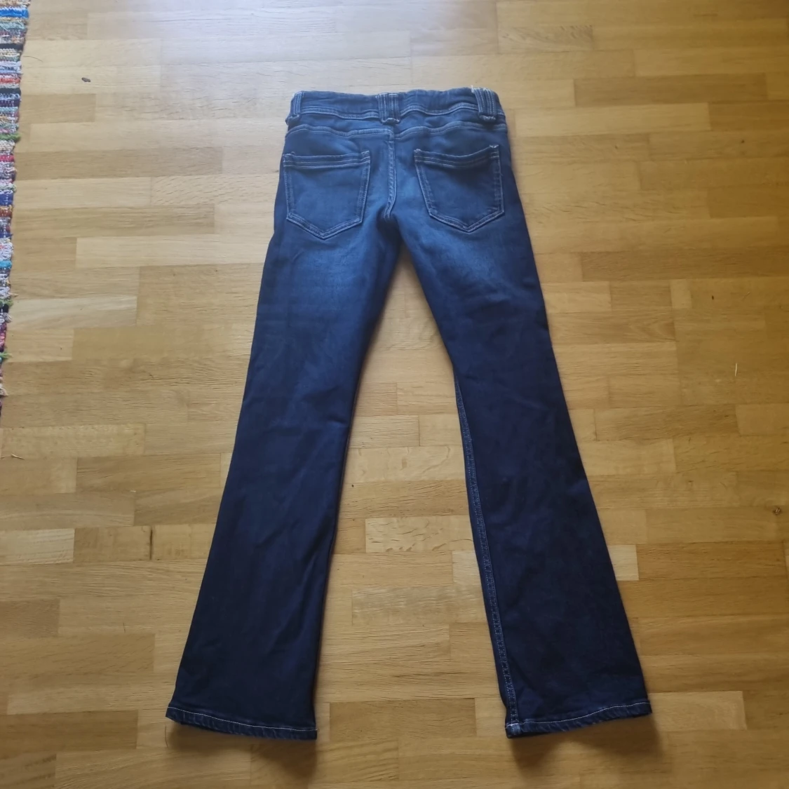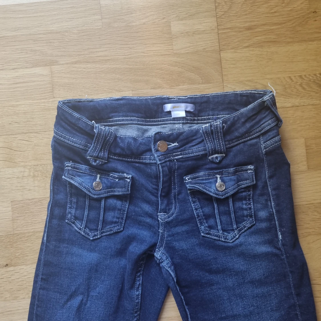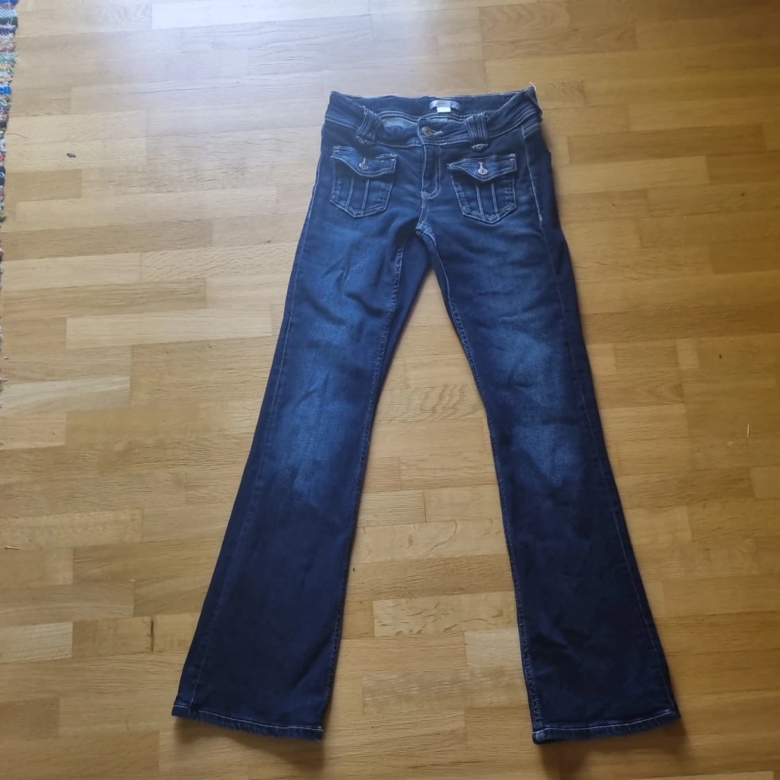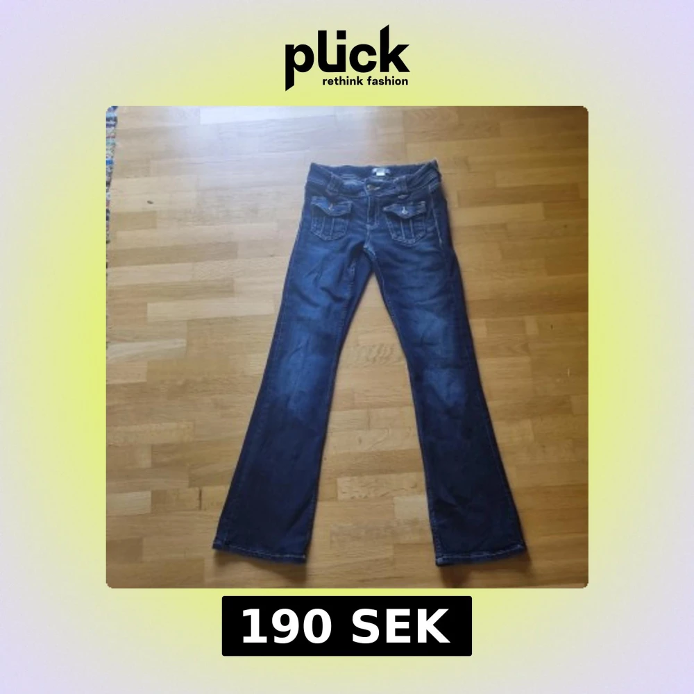 Snygga mörkblå jeans från Gina Tricot i bootcut-modell. Jeansen har låg midja, coola fickor med lock och knappar framtill samt klassiska bakfickor. Materialet är jeans med tydliga kontrastsömmar för en extra detalj. Har använd jeansen men de är i fint skick.