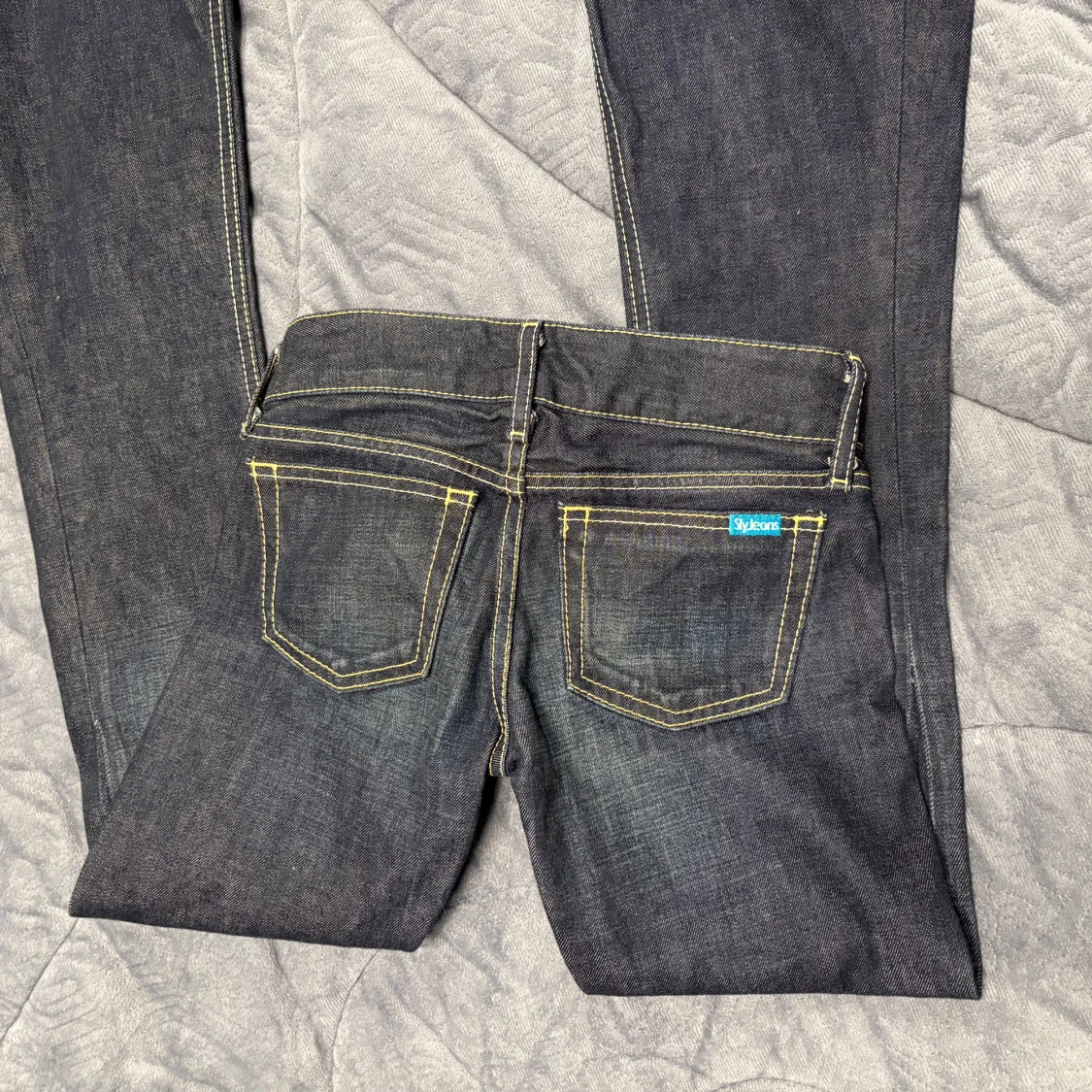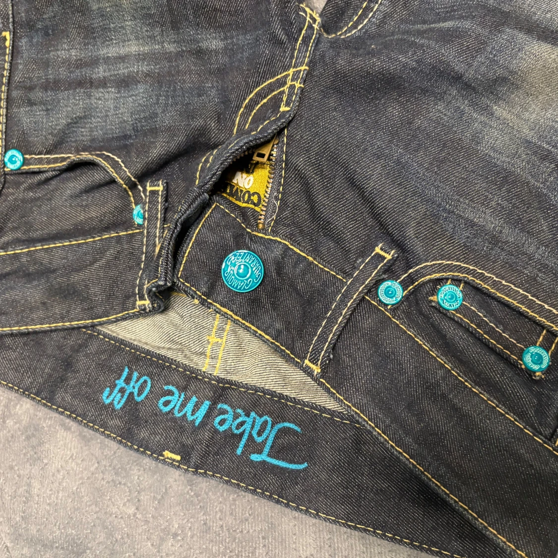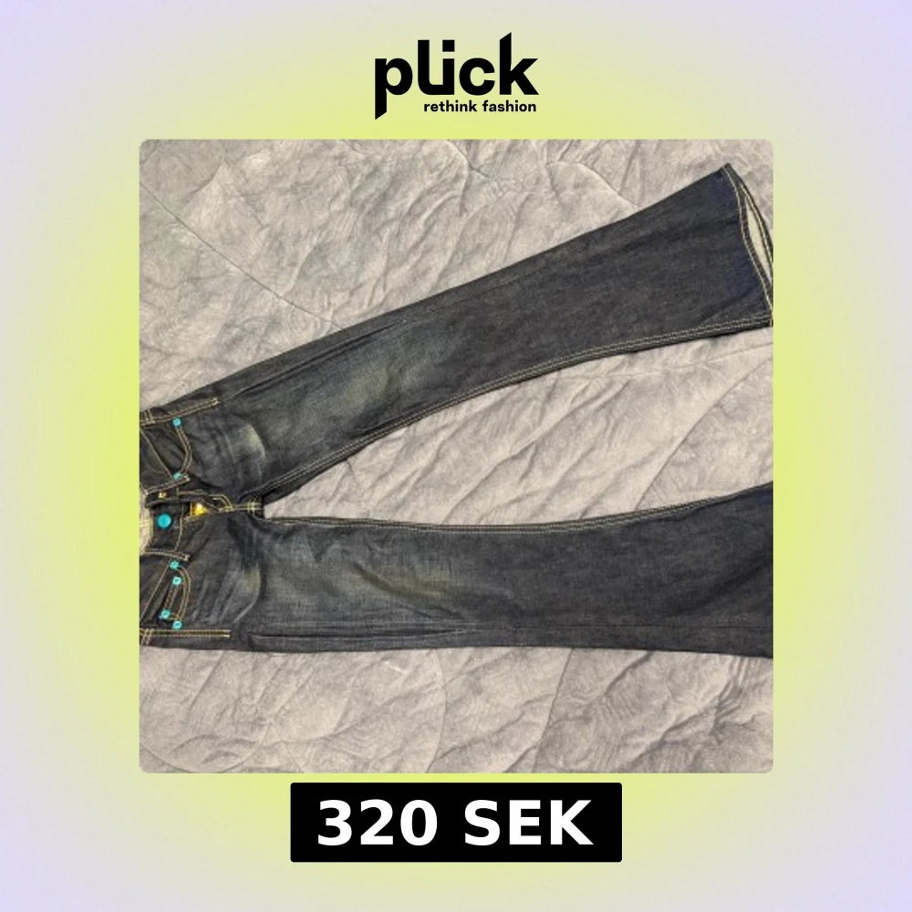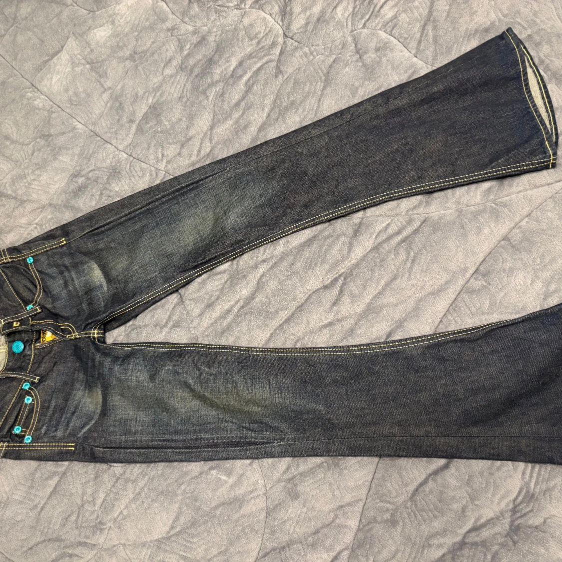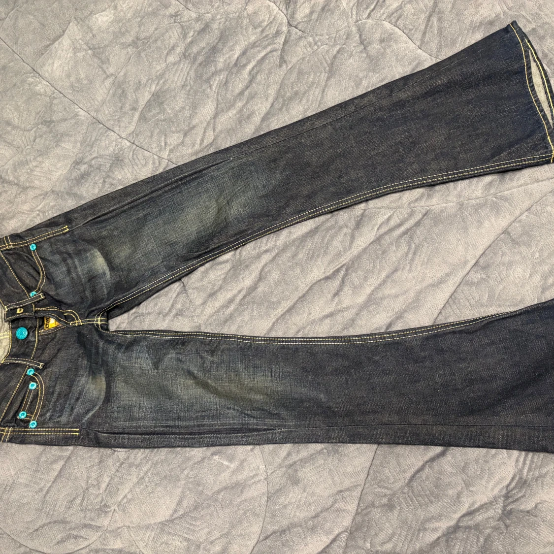 Snygga lådmidjade jeans med unika turkosa knappar och sömmar. Jeansen har en klassisk femficksdesign och en broderad logga på insidan. Perfekta för en cool och avslappnad stil. För små för mig, kan därav inte ta bilder när de sitter på!💕
