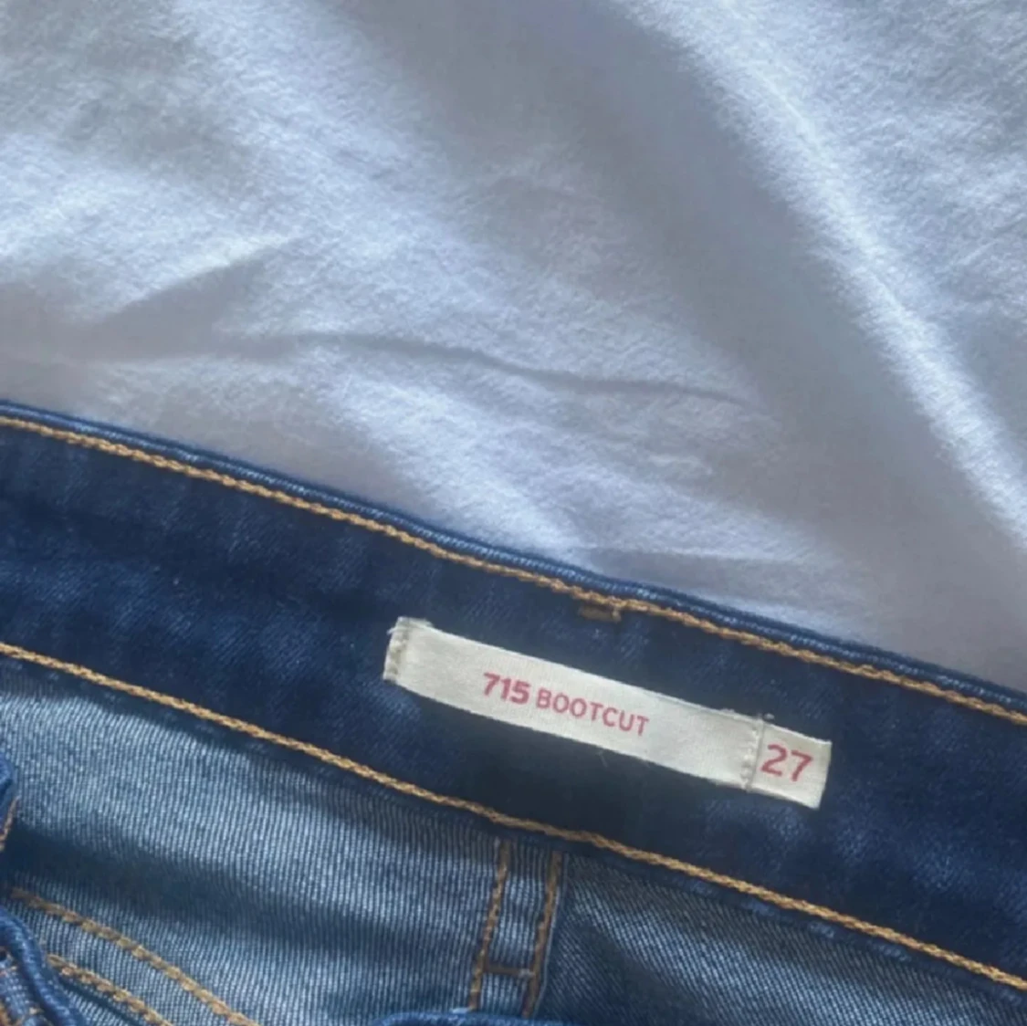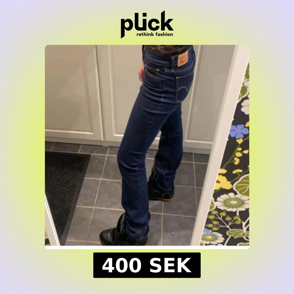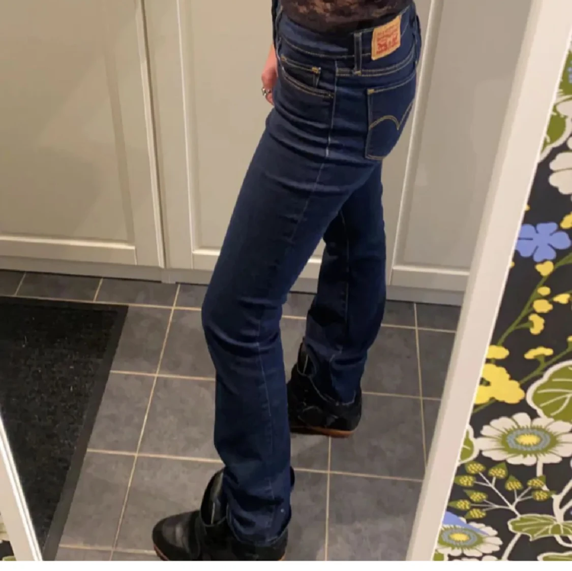 As snygga mörkblå jeans från levis. Lågmidjade och bootcut, helt perfekta. Passar mig som är 173!!🥰