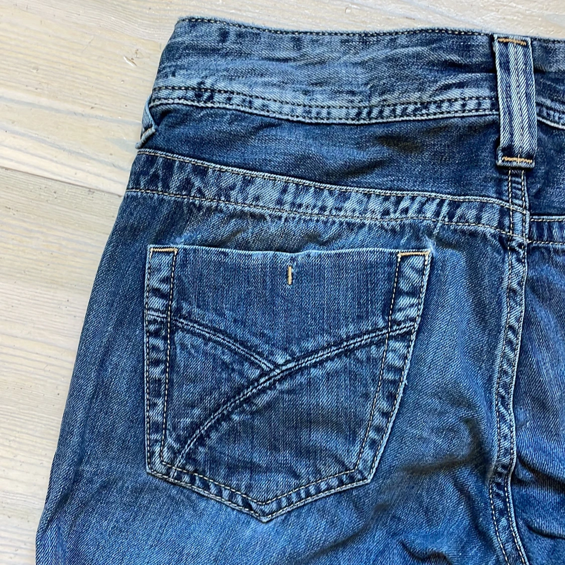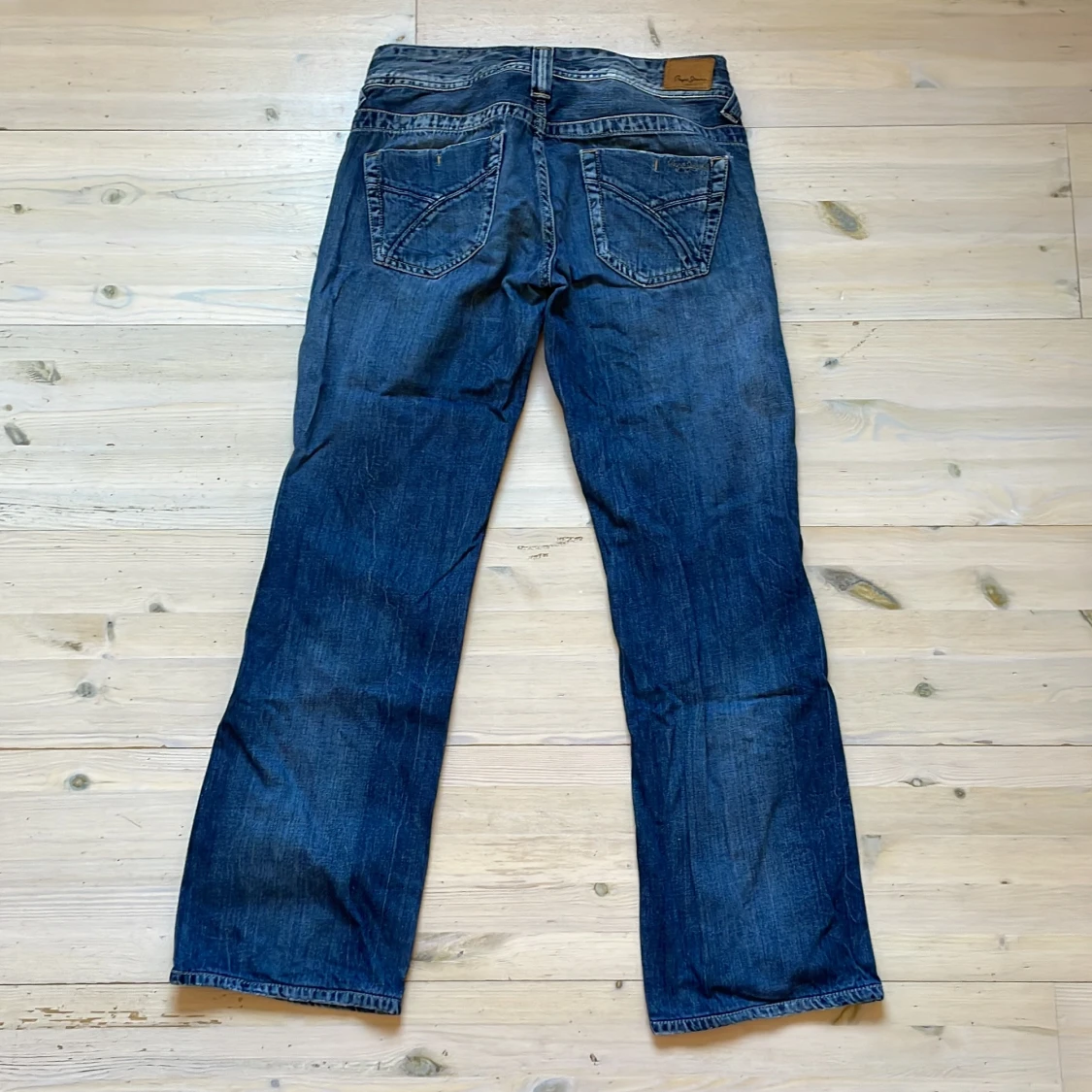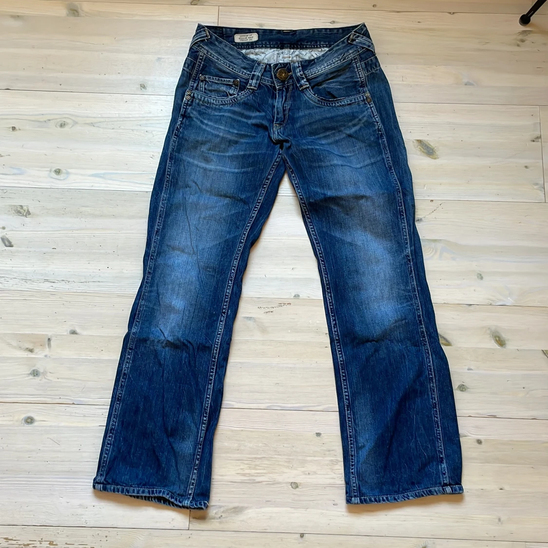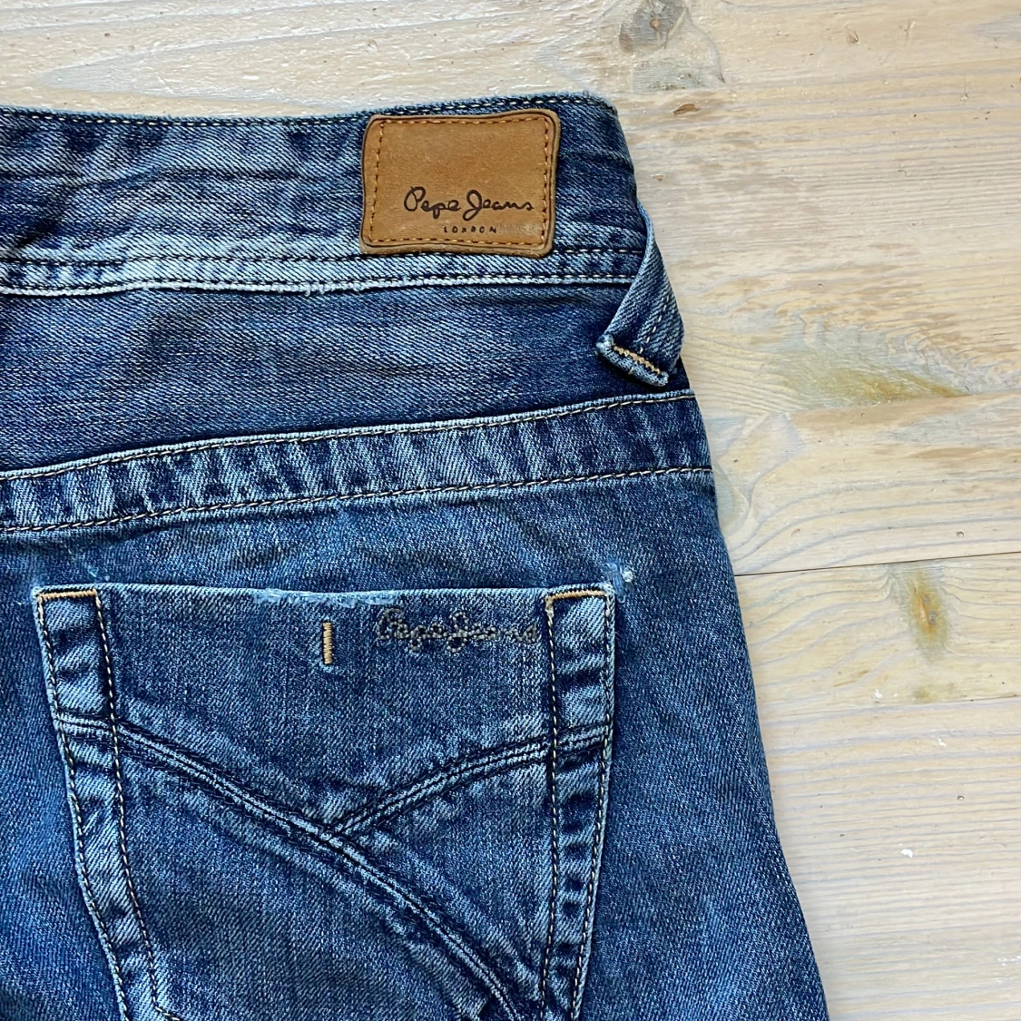 Supersnygga jeans i en perfekt blå färg från märket Pepe jeans. I jeansen står det (första bild) regular waist men de är ett av de mest lågmidjade jeans jag provat. Jag har aldrig använt jeansen men köpt på sellpy - där stod det mycket bra skick men har små skador vid bakfickakanten (se två sista bilderna). Ovansett så jeans i ett bra stark denim tyg. I byxorna står det w28 och l32. Storlek xs/s (längd passar någon runt 160, midjan blir mer lågmidjat om du är mindre).
