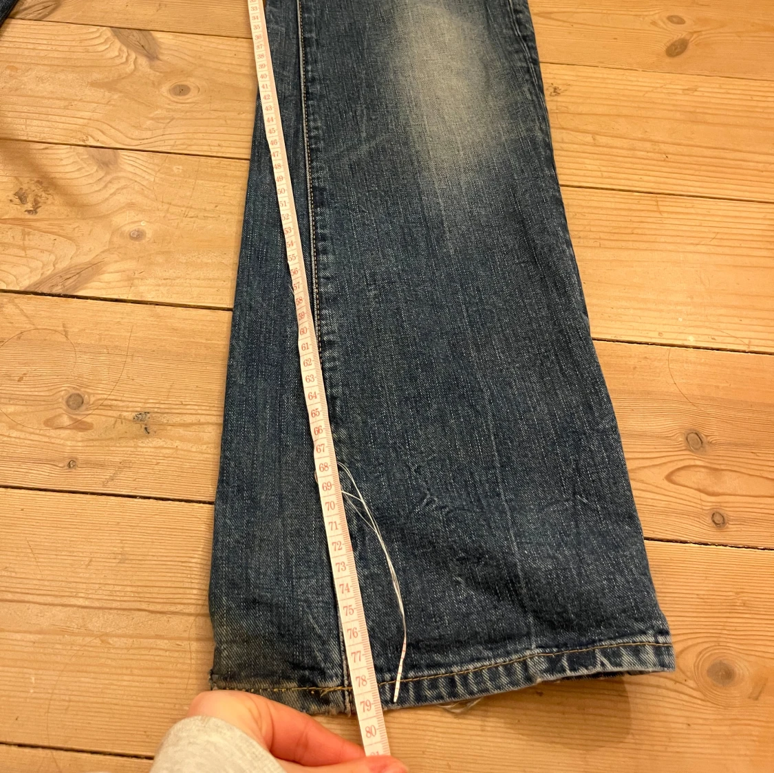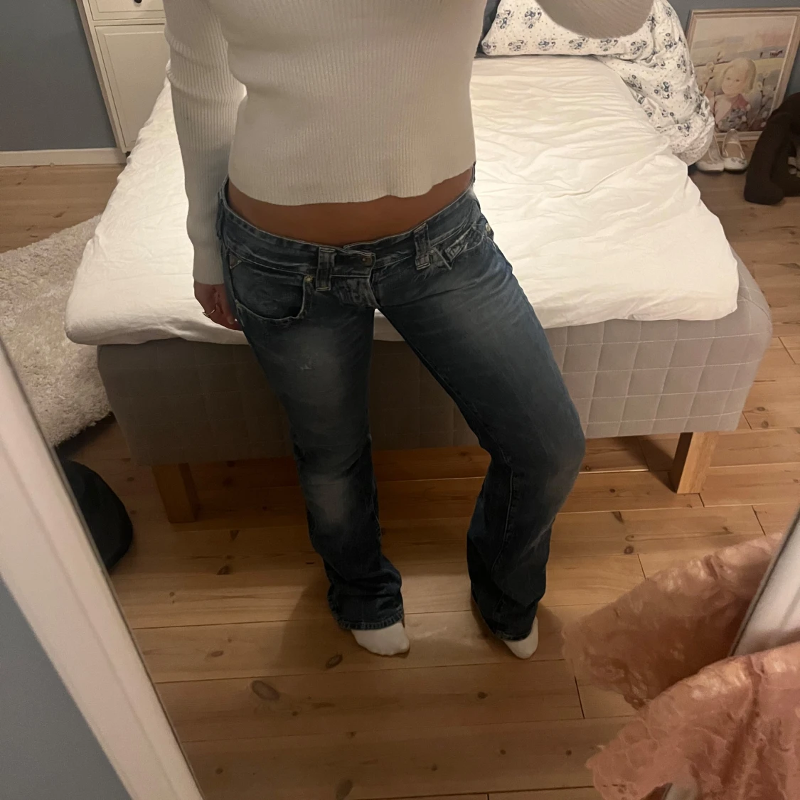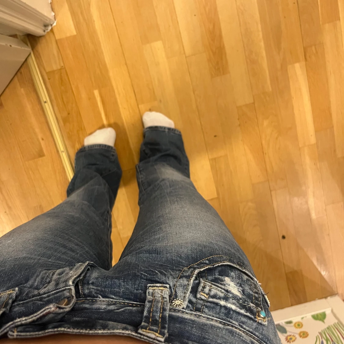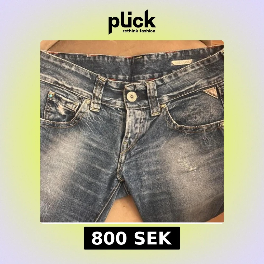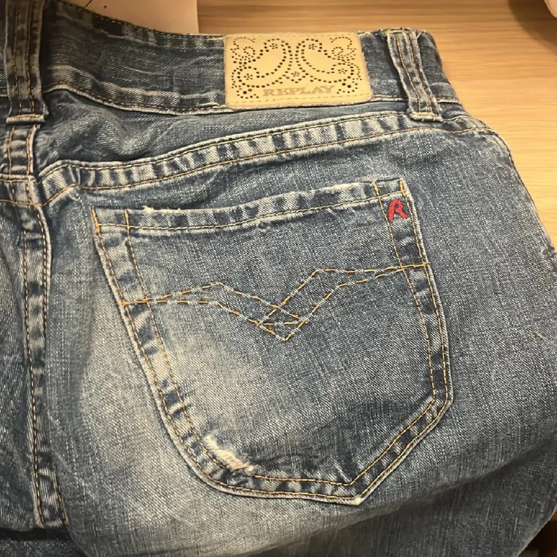 Snygga blå jeans från Replay med en sliten look och låg midja. De har klassiska fem fickor och en knappgylf. Midjemåttet är 38 tvärs över och jag är 160 för referens🩷