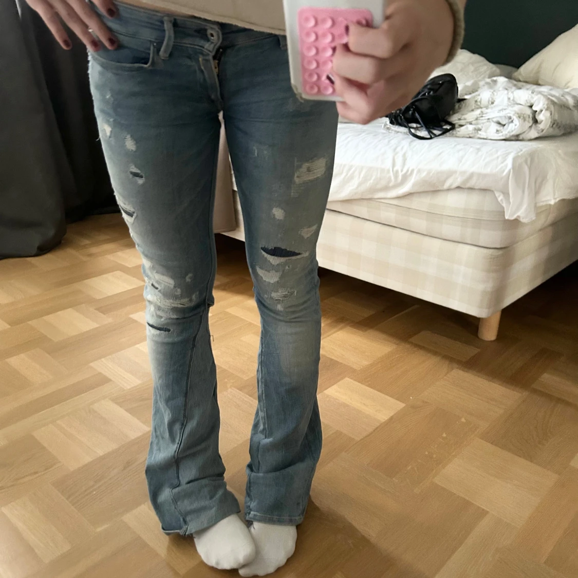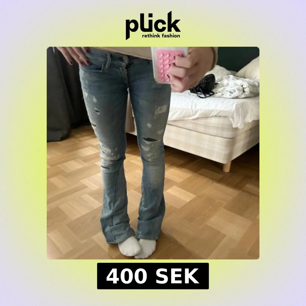 Säljer ett par blå jeans med slitningar och hål för en cool, avslappnad look. Modellen är bootcut med lätt utsvängda ben och klassiska fickor bak. Jeansen har låg midja och är gjorda i mjukt denimtyg som sitter snyggt på kroppen. Skriv för eventuella frågor💓