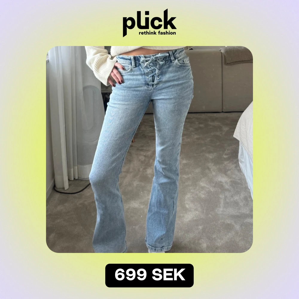 Super coola jeans med snörning! Innebenslängden: 77cm Midjemåttet: 35 men det går att justera större eller mindre i och med knytningarna🩵💙