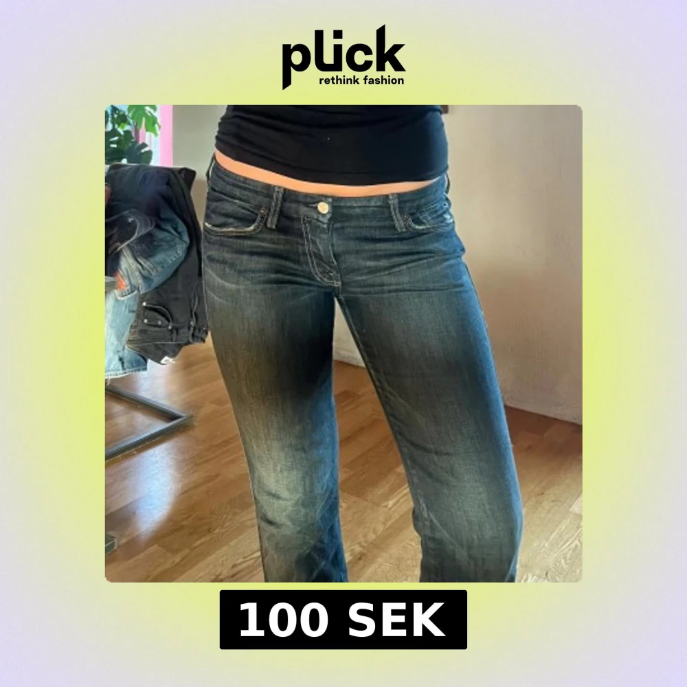 Säljer ett par blå bootcut jeans med låg midja och klassiska fem fickor. Jeansen har slitna detaljer vid benslut och en reva vid bakfickan tyvärr. Storlek 29