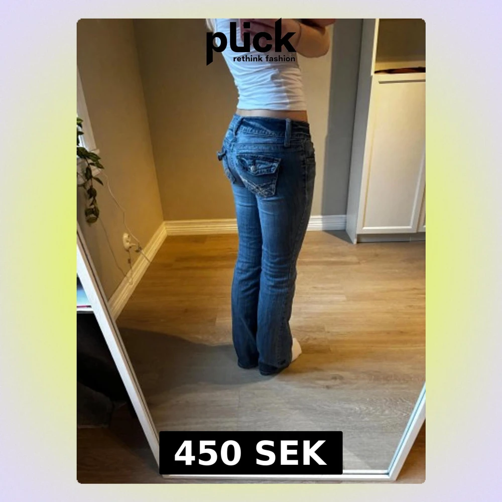 Snygga unika lågmidjade utsvängda jeans i snygg tvätt. Fickorna har snygga detaljer och knäppning. Midjemått: 38 cm Innerbensmått: 79 cm