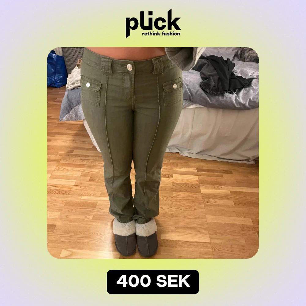 Säljer ett par olivgröna byxor från H&M Divided i storlek 38. Byxorna har en normal passform med knappar och fickor fram. Perfekta för höst och vår, och de är i mycket bra skick. Säljs inte längre på hm!