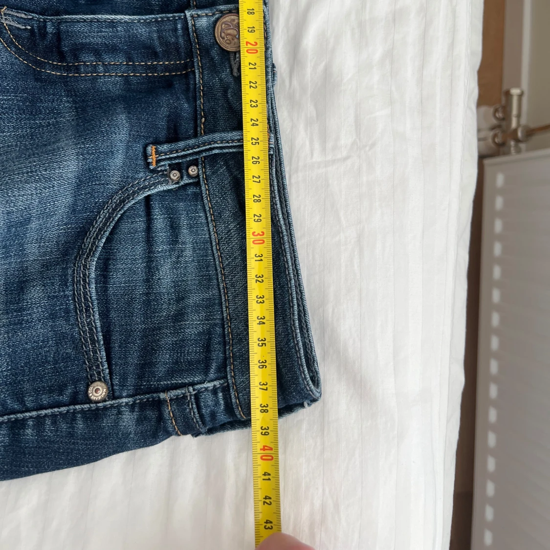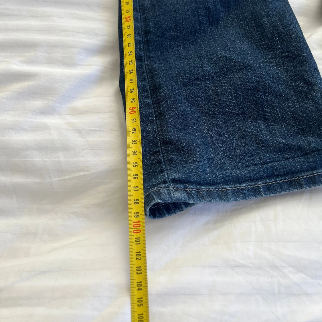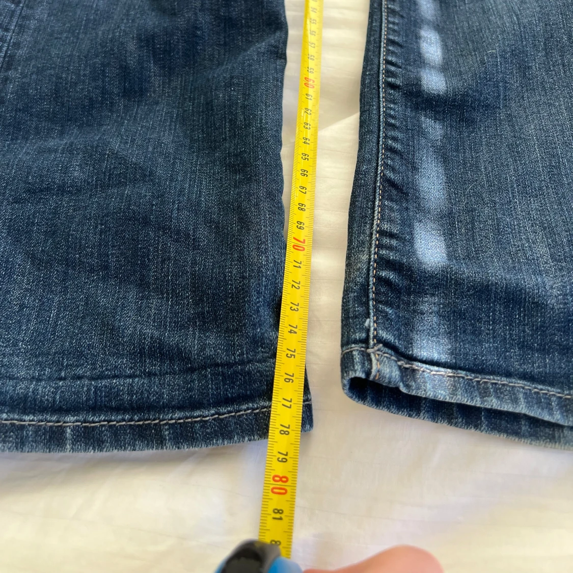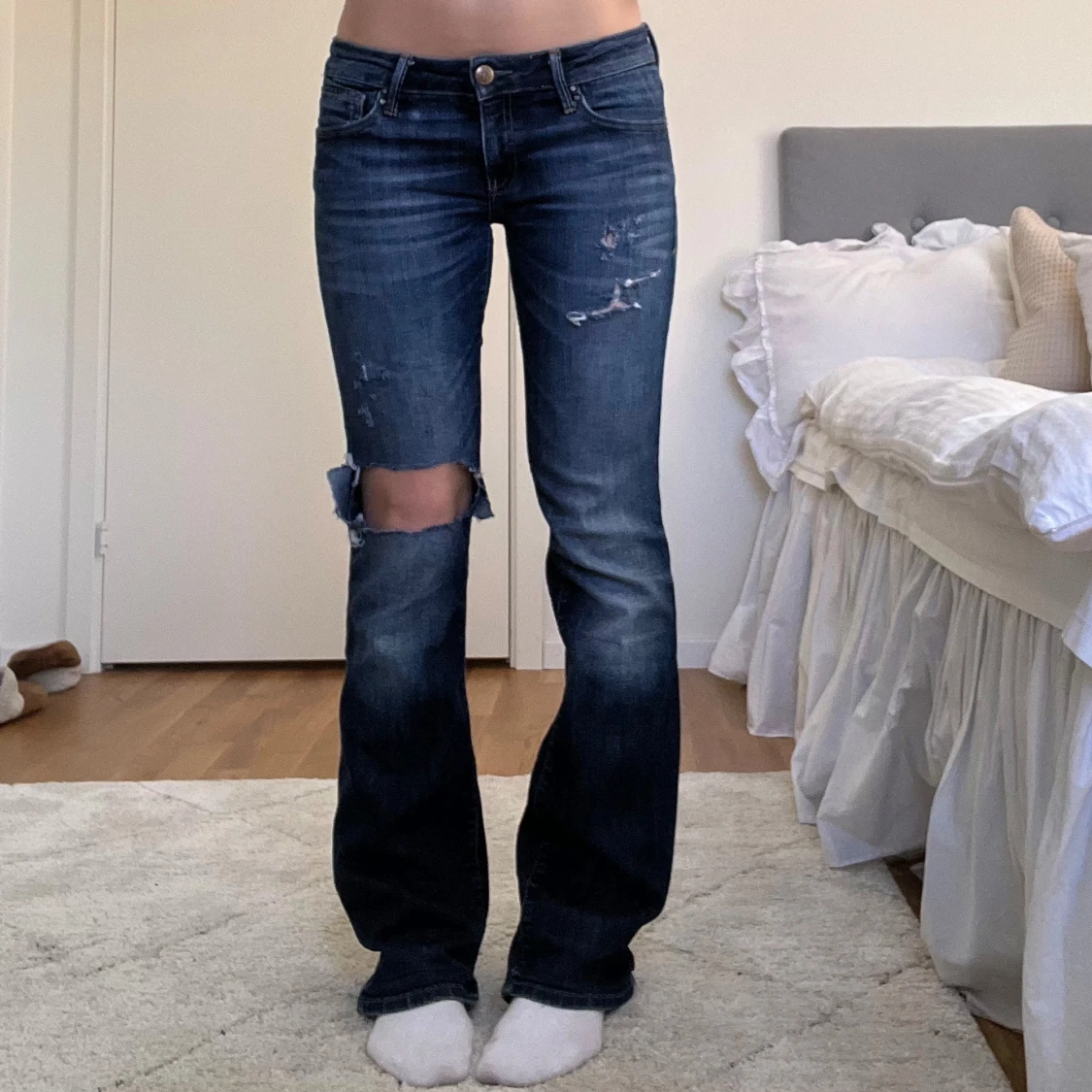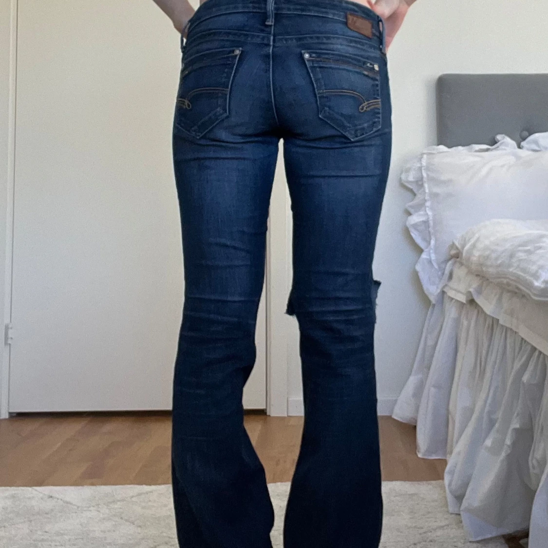 Mörkblå lågmidjade utsvängda jeans i mycket bra skick. Skulle uppskatta storleken är xs-s, måtten finns bland bilderna🥰