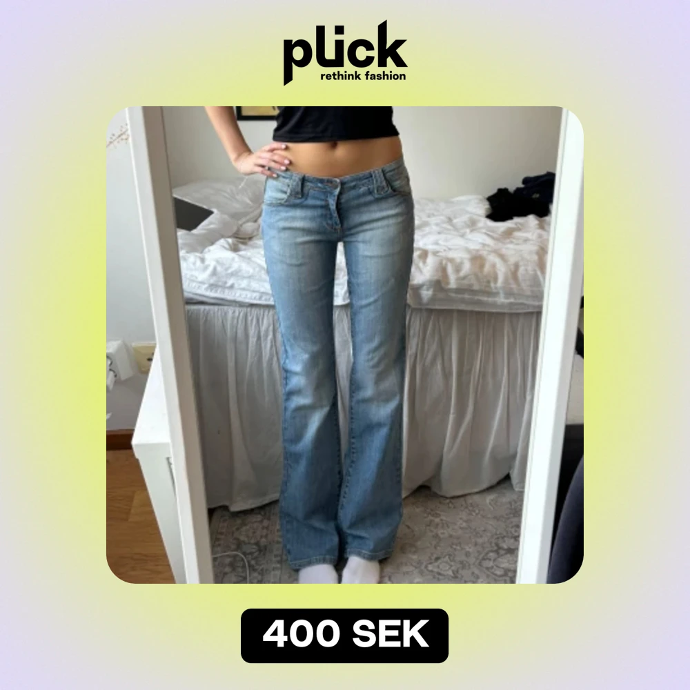 Ett par vintage lågmidjade bootcut/flare jeans i ljusblå färg. Storlek W30 L33, jag på bilden är 172cm och brukar ha S/M i jeans💕