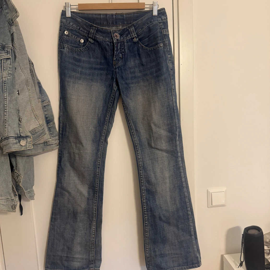Säljer ett par blå lågmidjade jeans som är utsvängda. Köpte från Vinted men De är lite stora enligt mig då jag föredrar när jeansen sitter tajtare (de sitter som bootcutjeans om man har större storlek). De går att knyta i midjan som tidigare ägaren satt in💗 innerbenslängd:80,5 midjemått rakt över: 39,5