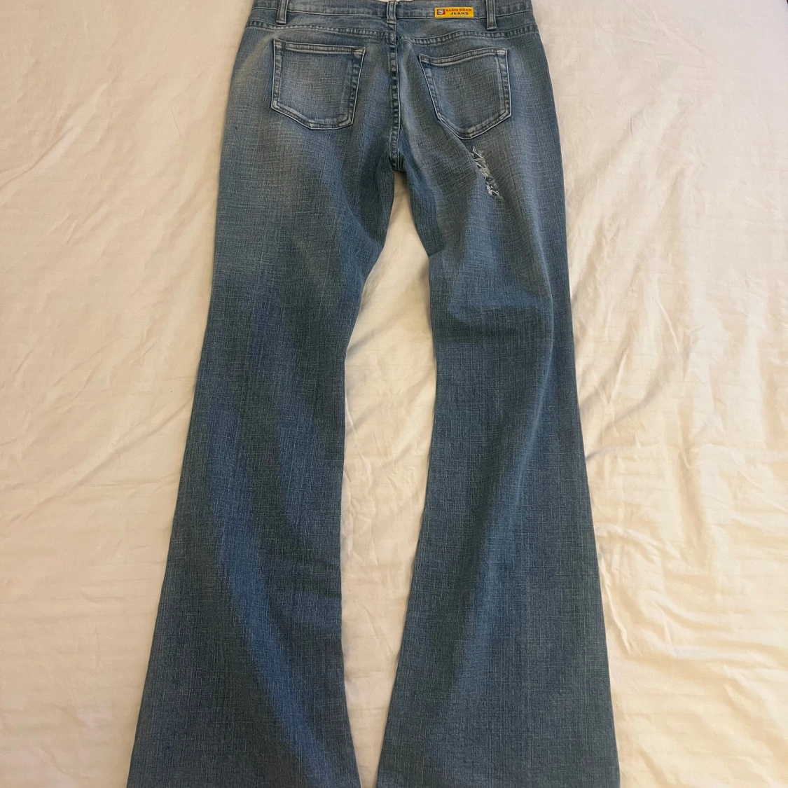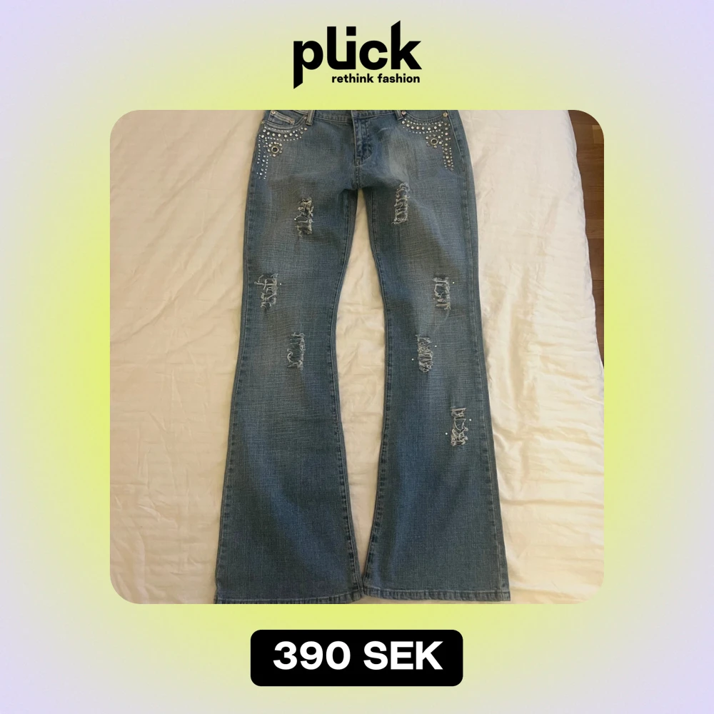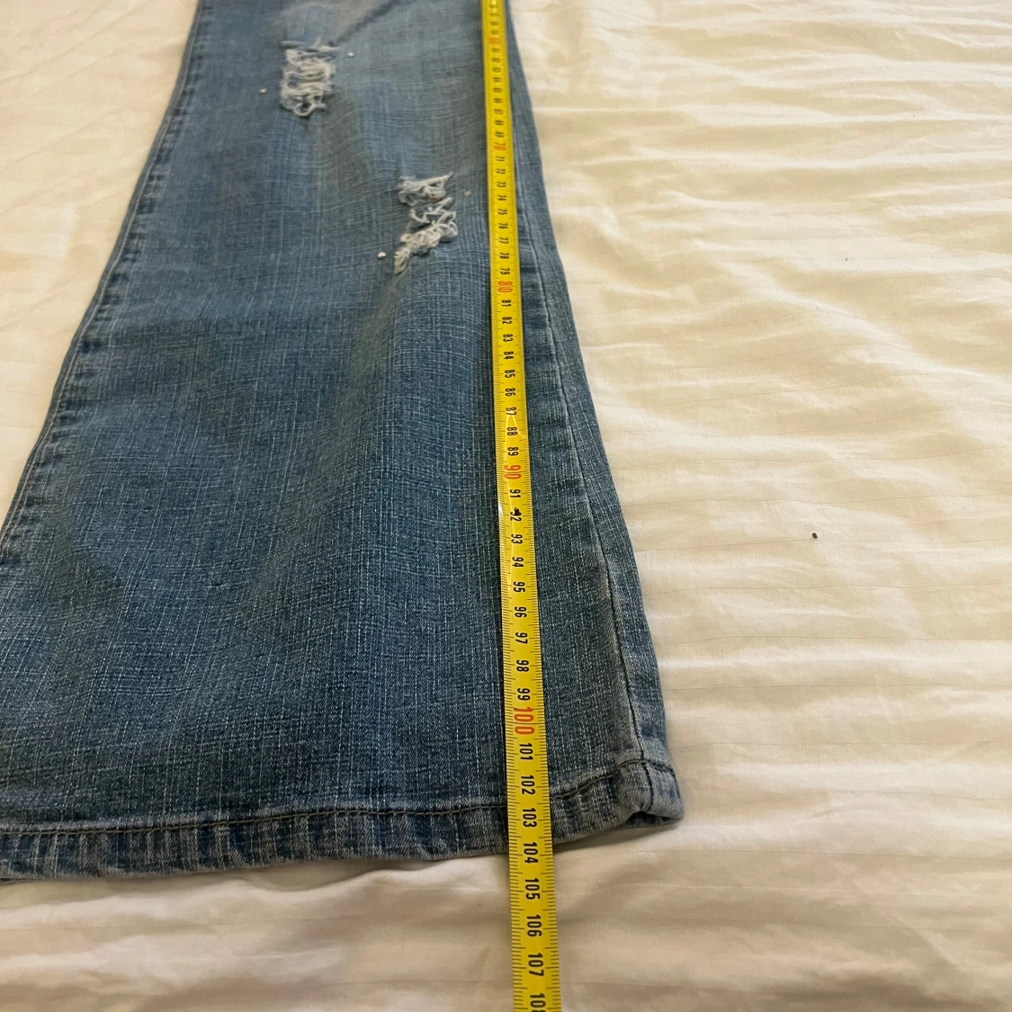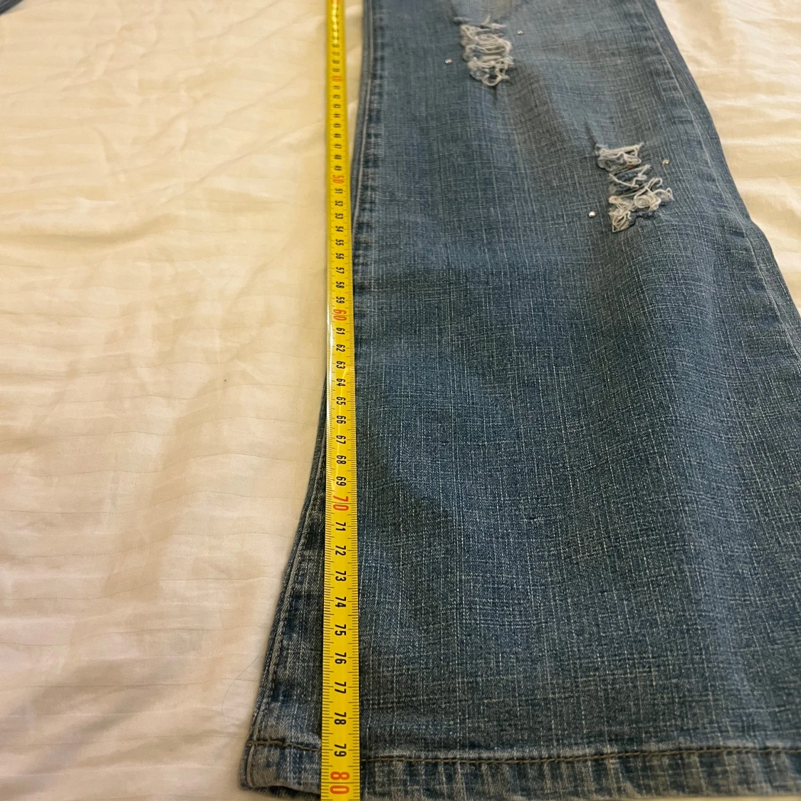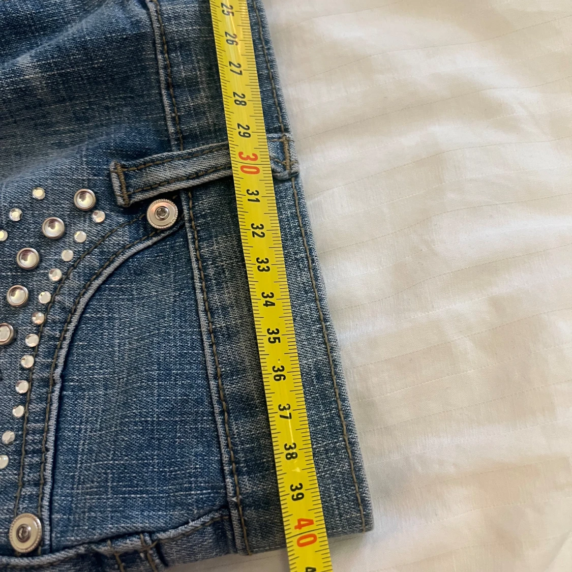 Snygga blå lågmidjade utsvängda jeans med coola detaljer i superbra skick, inga tecken på användning ❣️ Måtten finns bland bilderna men det som inte finns plats är grenmått: 24 cm och lårmått: 24 cm❣️