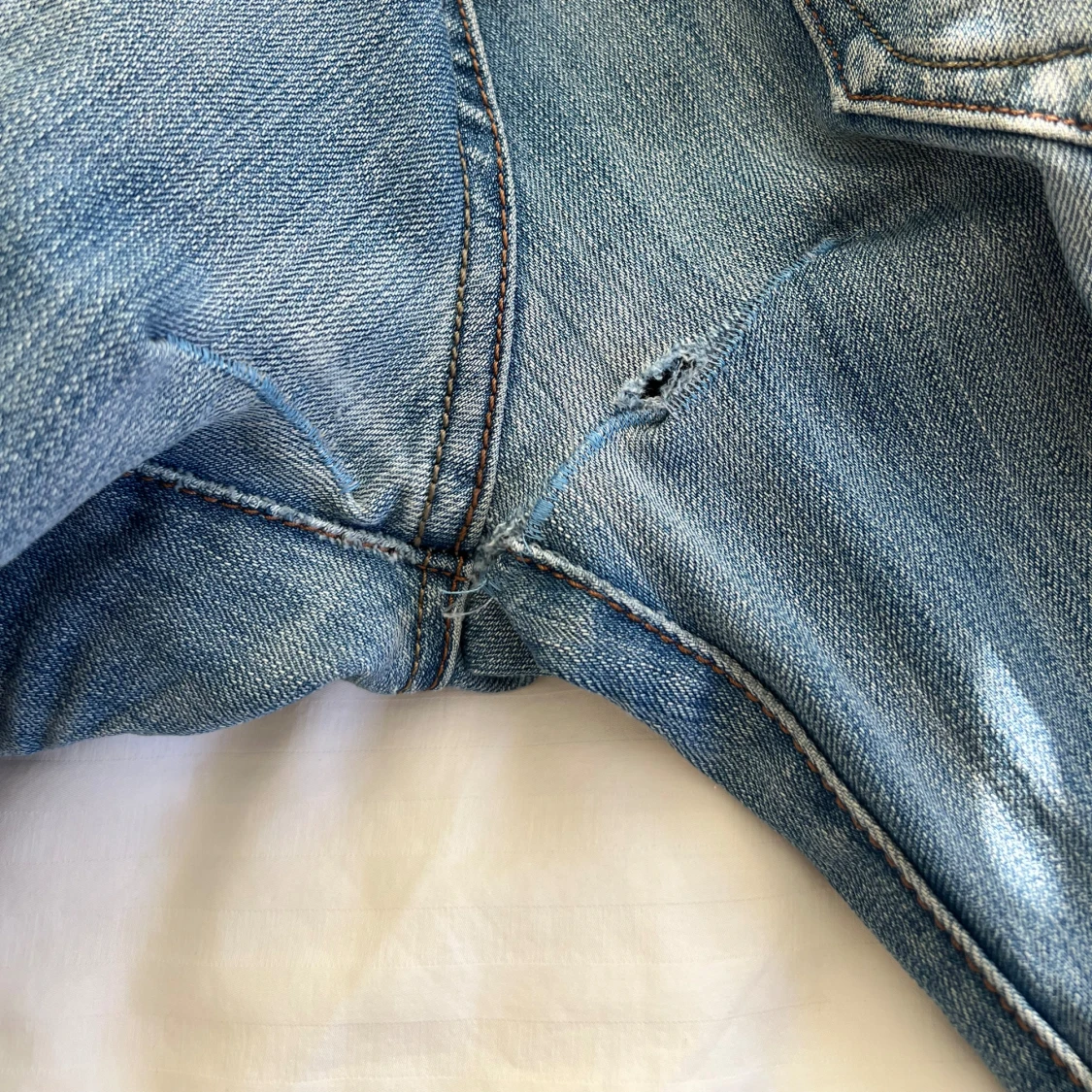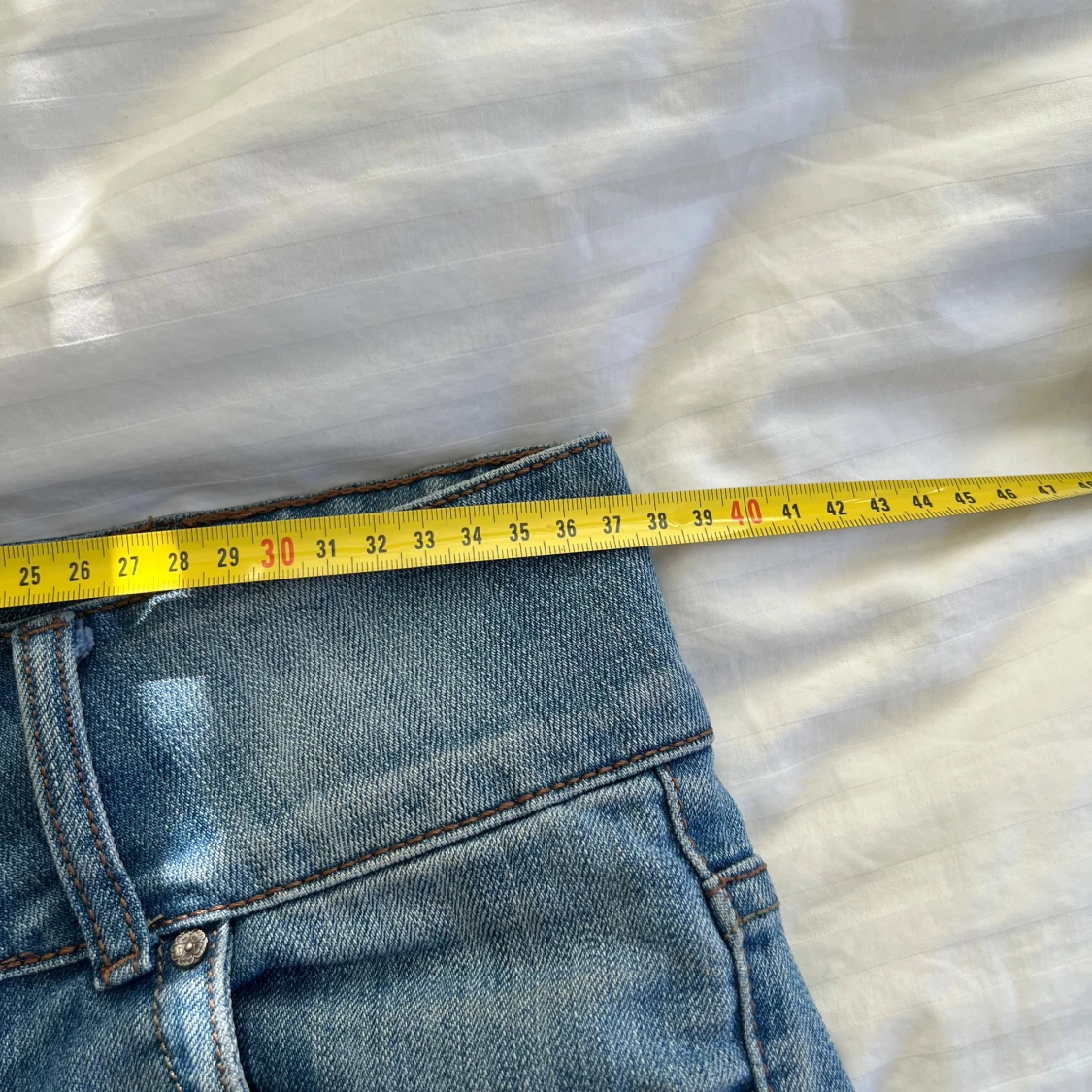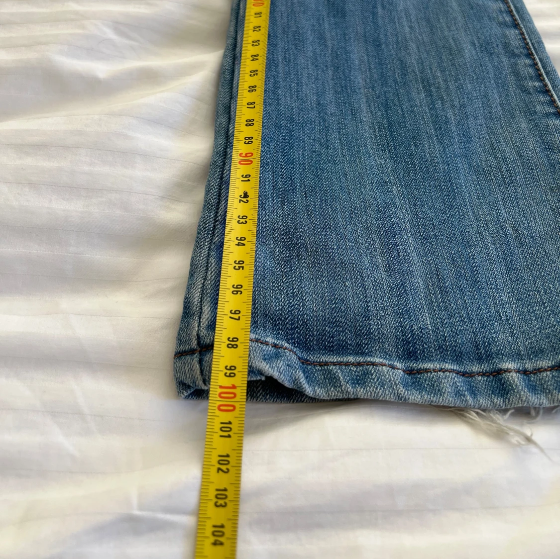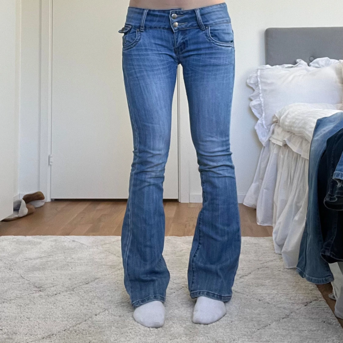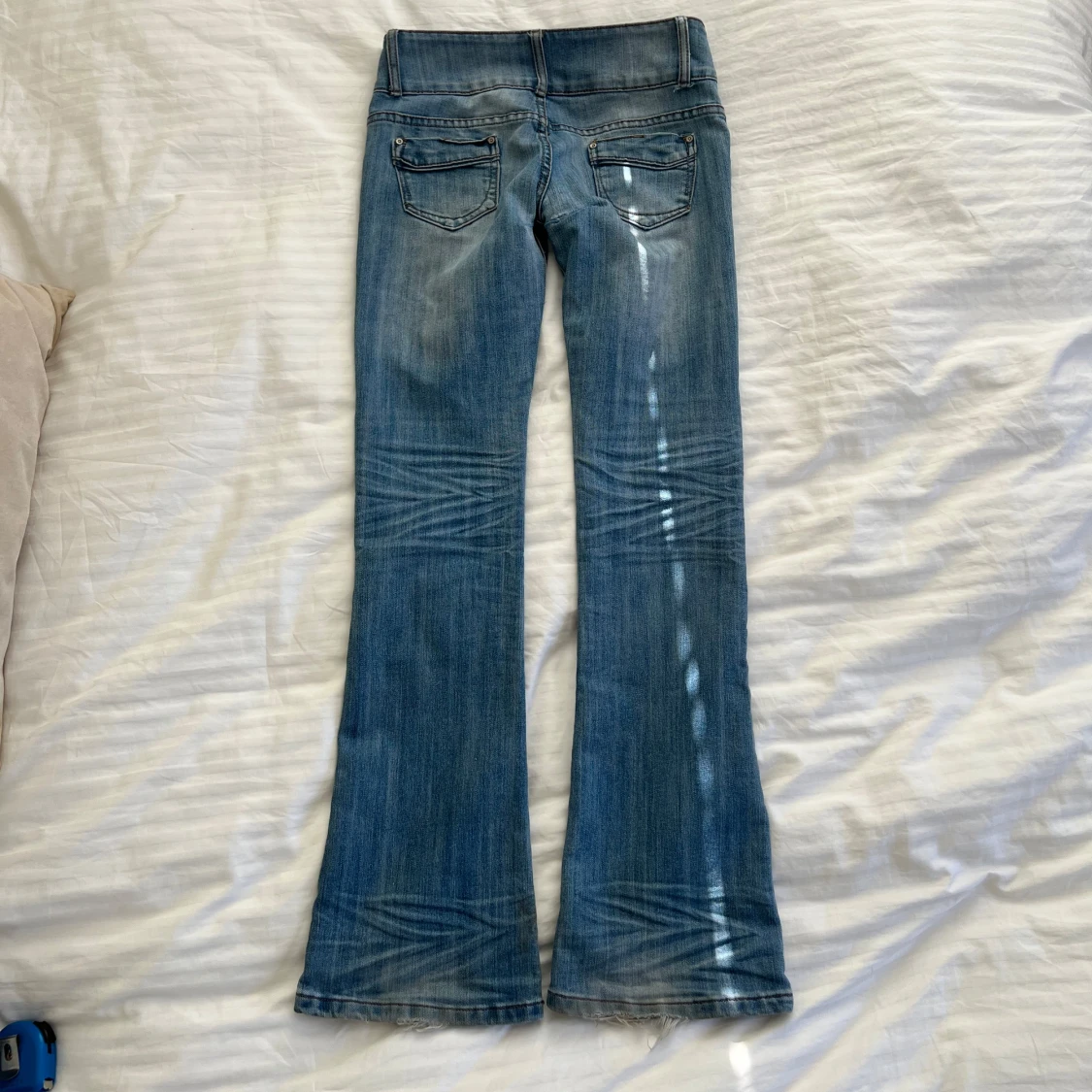 Ljusblå lågmidjade utsvängda jeans i hyfsat bra skick. Måtten finns bland bilderna, notera att de har gått sönder lite på ett ställe (se sista bild) men det är enkelt att fixa🥰