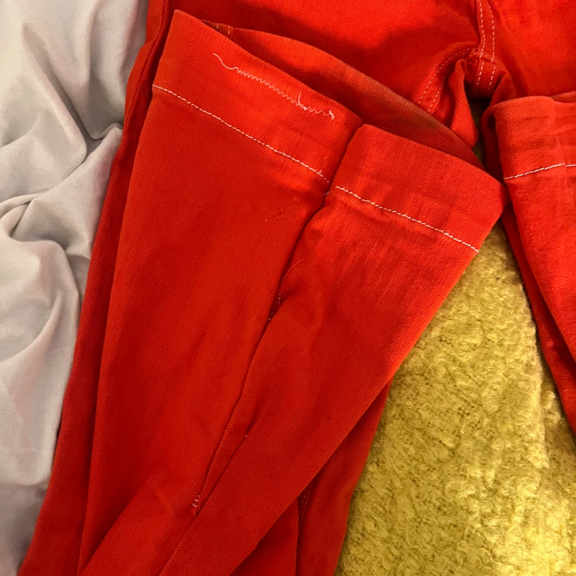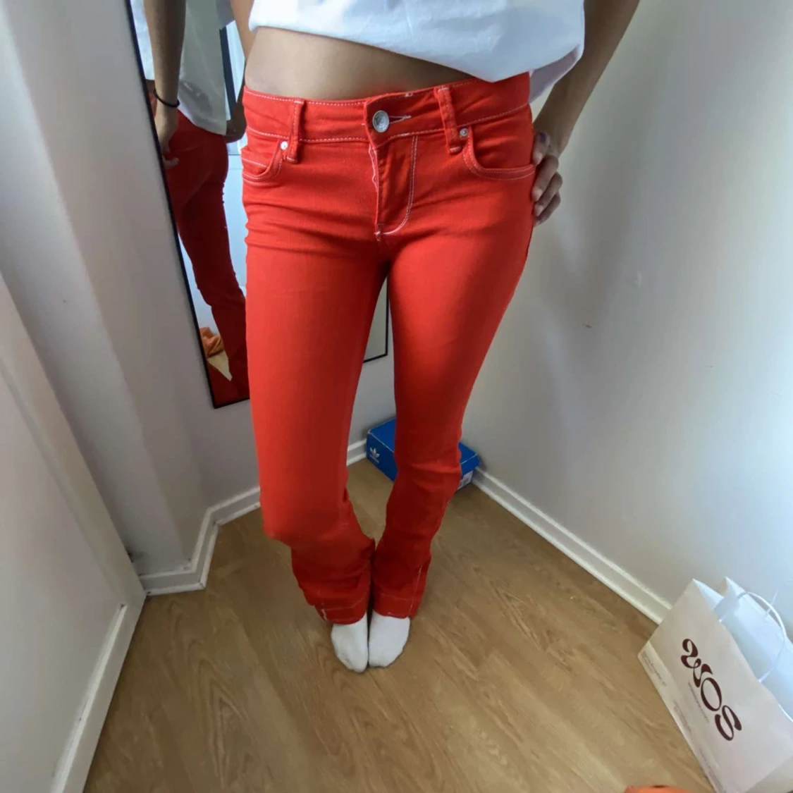 Piss snygga Lågmidjade utsvängda röda jeans! Har dock behövt sy in dom där nere för att dom var så utsvängda där av resultatet där nere(dock inget man tänker på)😍