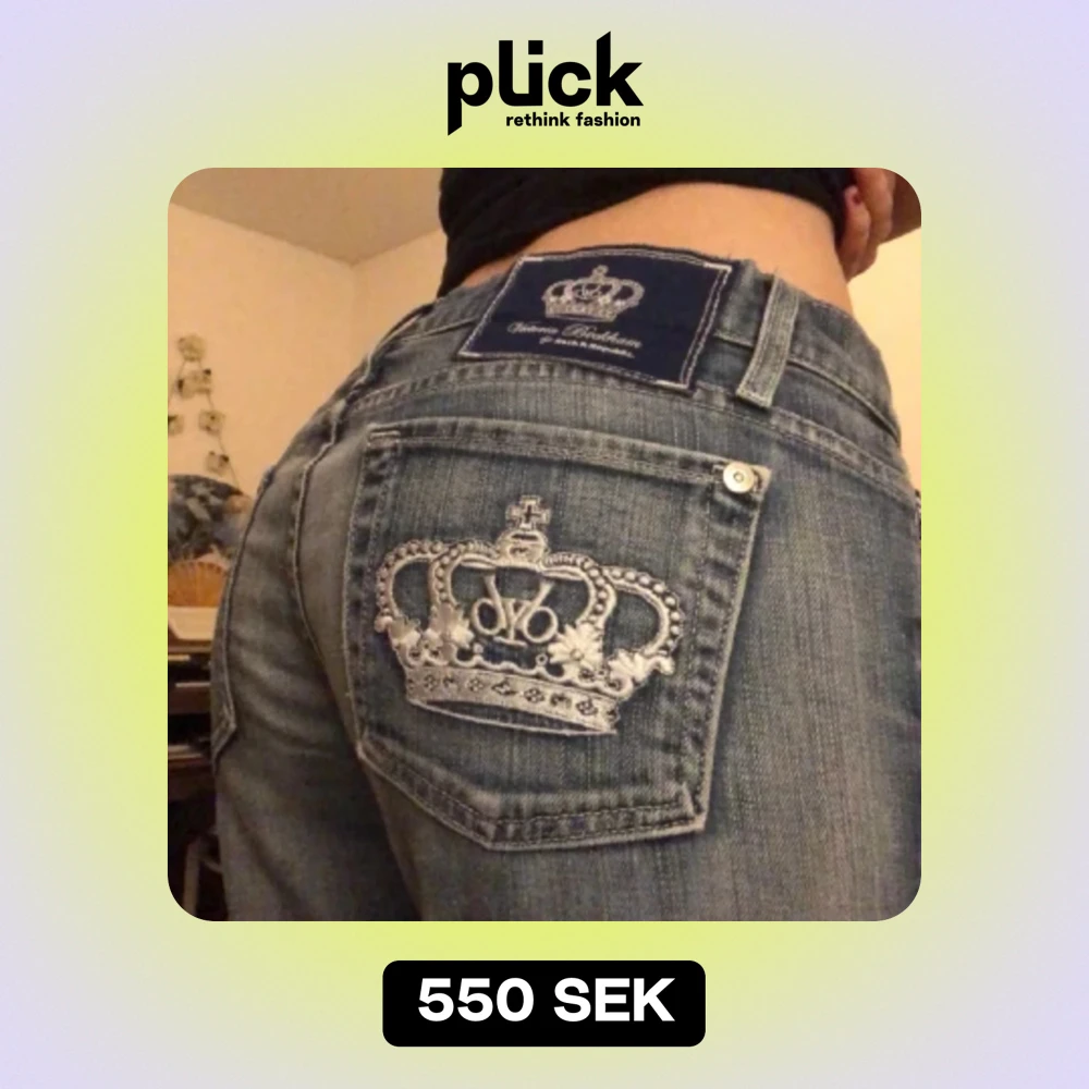 As snygga låga midjade Victoria Beckham jeans med coola detaljer på fickorna🤩🤩 jeansen ör i bra skick förutom en slitning som man ser på bild 3