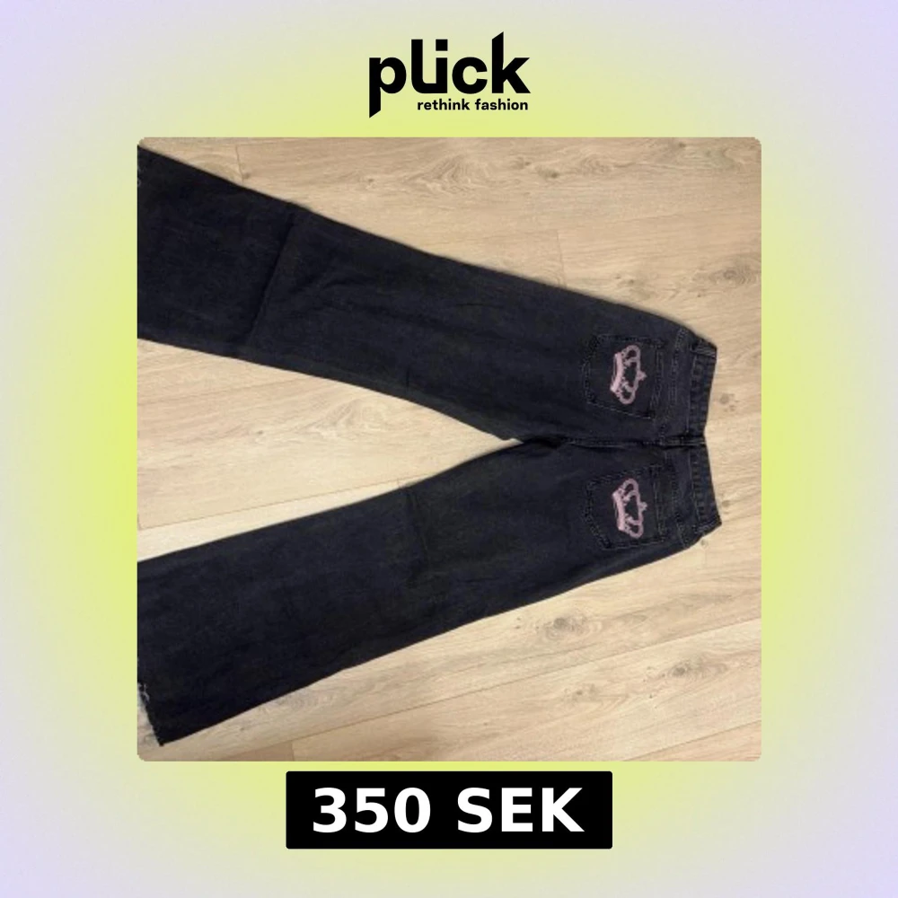 Snygga svarta jeans med rosa broderade kronor på bakfickorna. De har en klassisk femficksdesign och en rak passform som ger en avslappnad look. Lågmidjade!