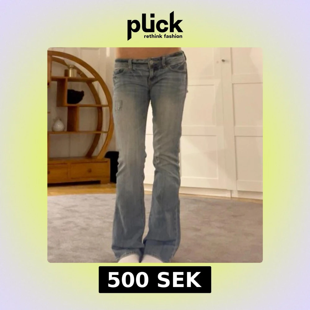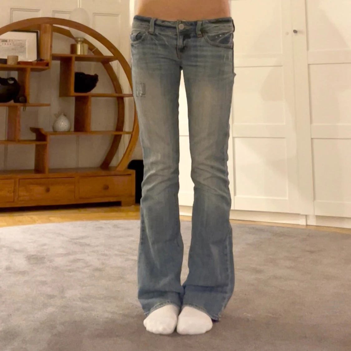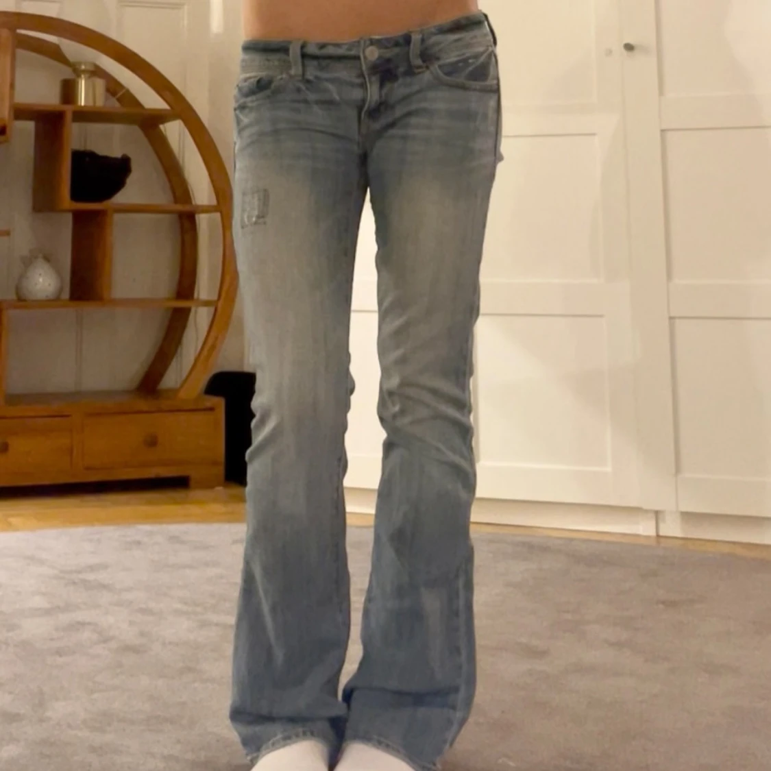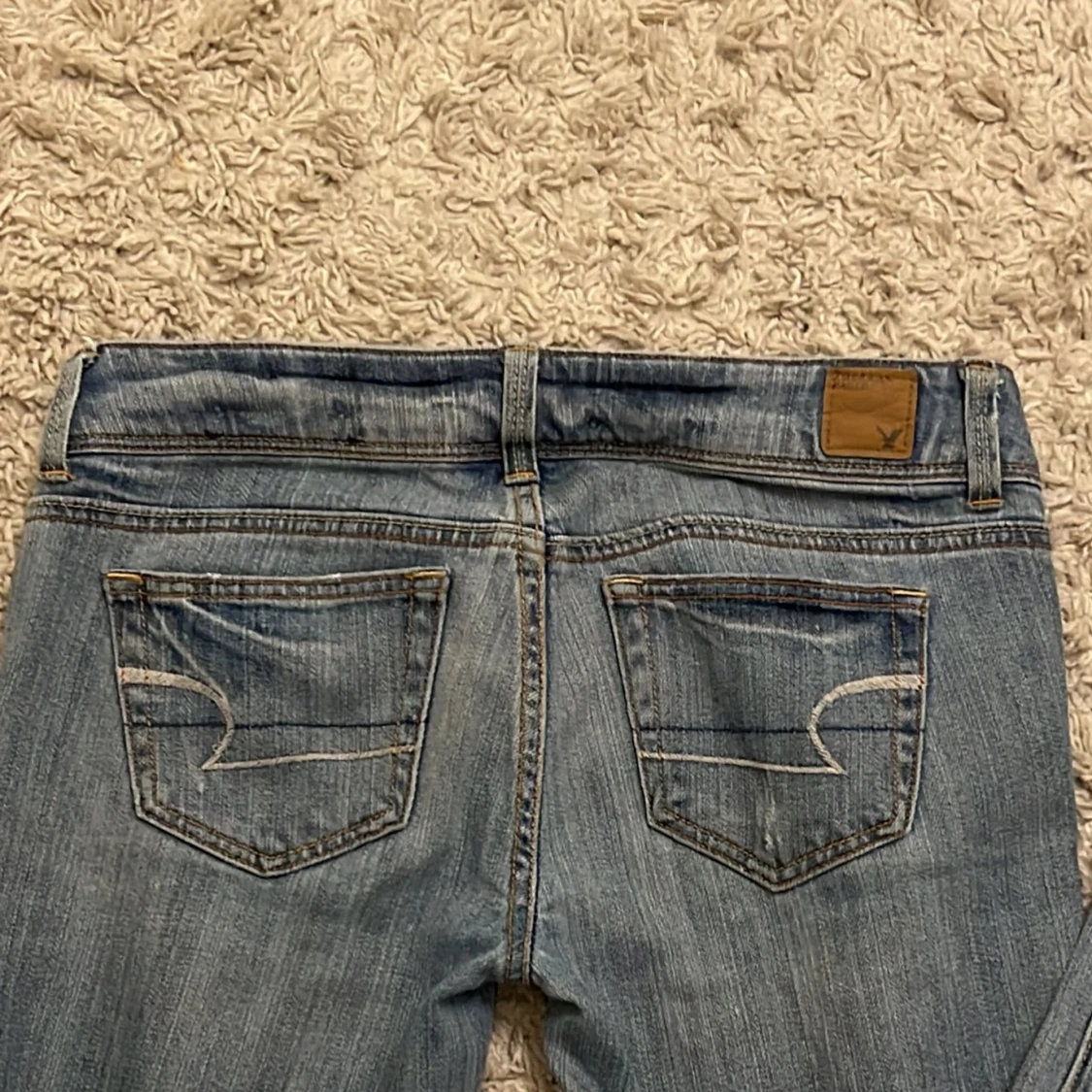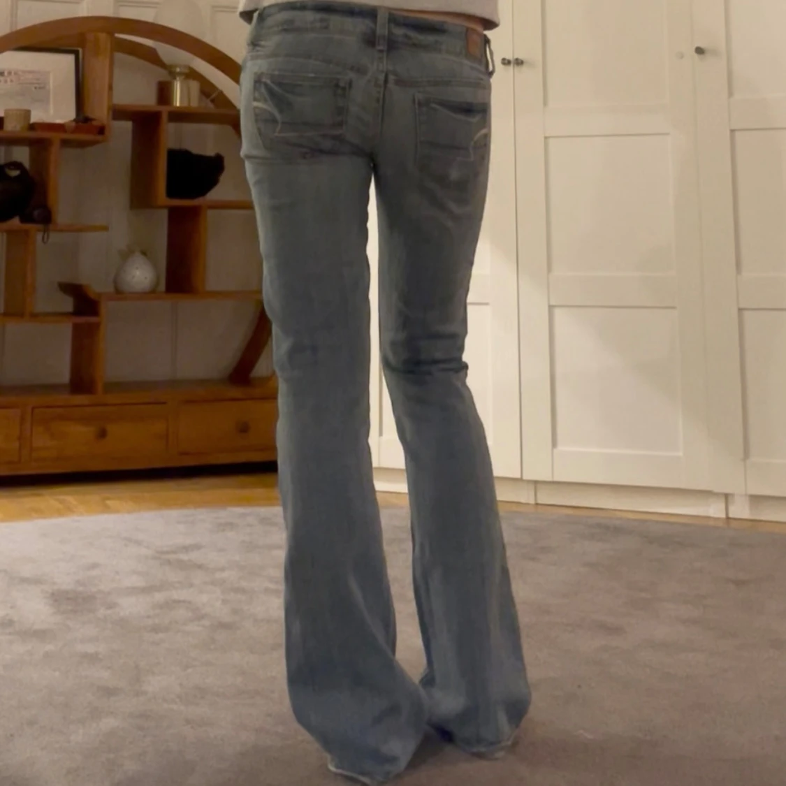 Jätte snygga vintage bootcut lågmidjade jeans från american eagle, midjan rakt över: 38,5 cm. Innerbenslängden: 81 cm.