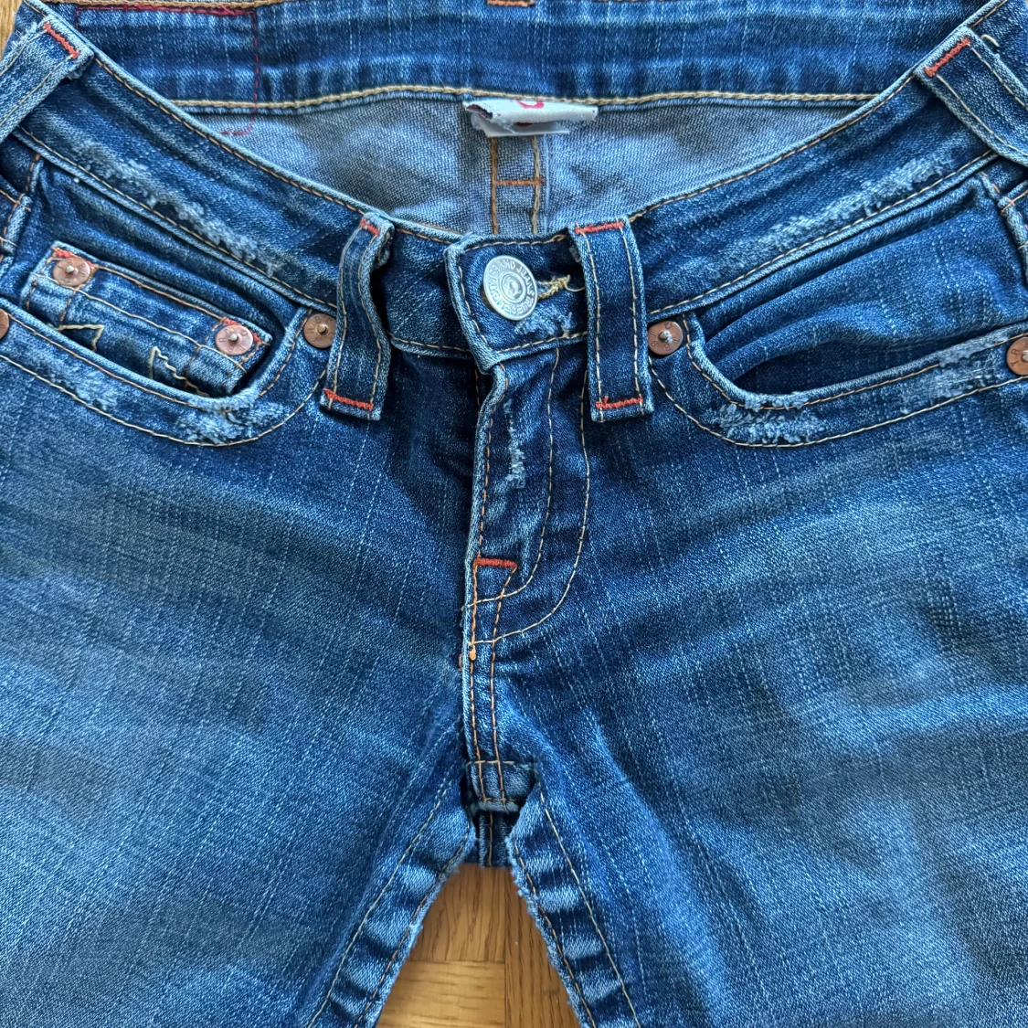 Vintage true religion jeans i bra skick, lågmidjade och bootcut/flare. Har två små hål/slitningar på benen som är en del av modellen. Uppsprättade längst ner på benen. Innerbenslängden är 77cm och midjemåttet är 39cm från sida till sida.