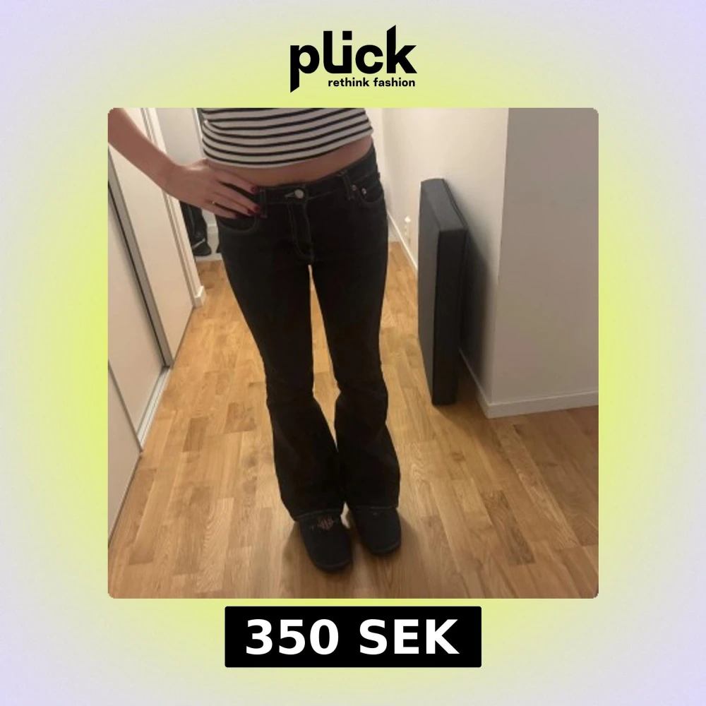 Säljer ett par svarta jeans med bootcut-modell och klassiska kontrastsömmar. Jeansen har låg midja och fem fickor, tillverkade i ett robust denimtyg. Perfekta för dig som gillar en tidlös och snygg siluett.