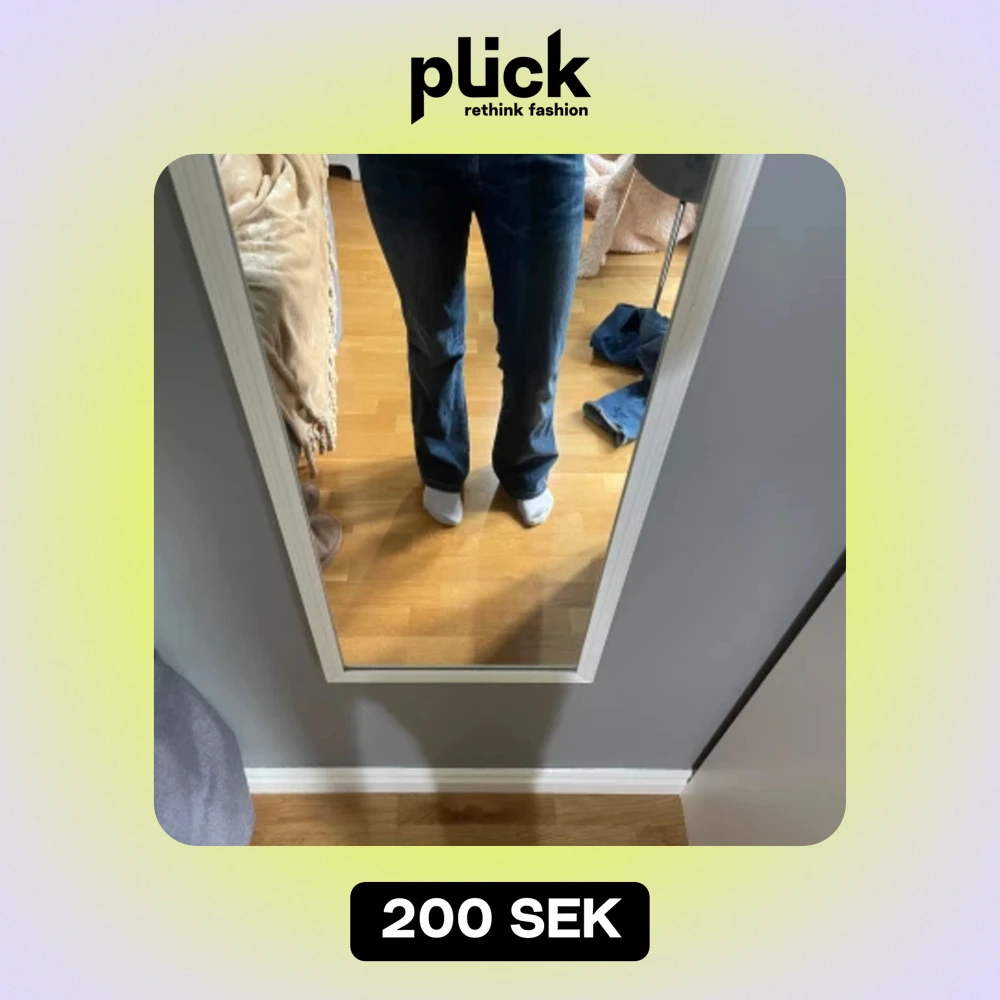 Säljer ett par mörkblå jeans i bra skick. De har en klassisk bootcut-stil och är lågmidjade. Perfekta för en avslappnad look!
